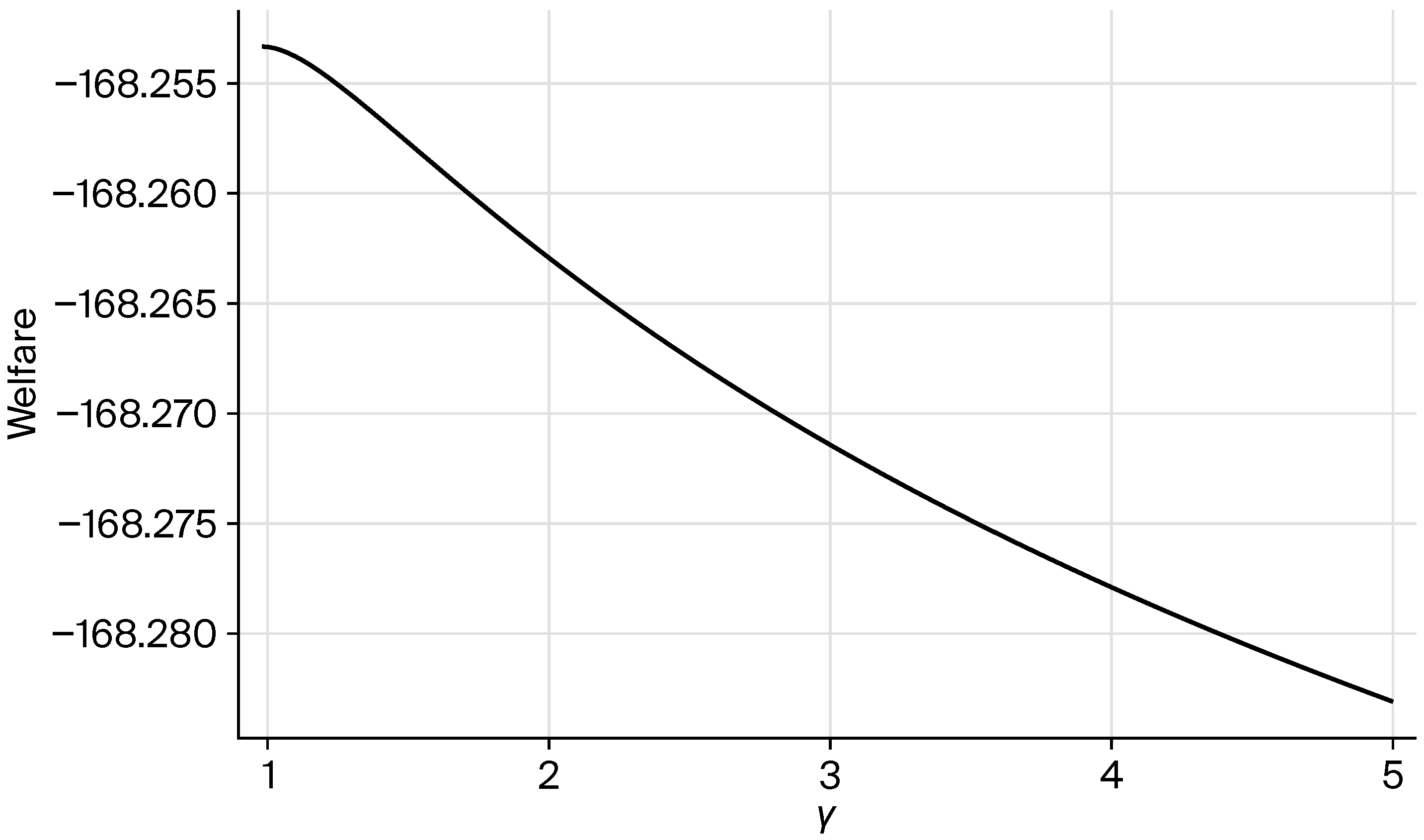 . We conduct robustness checks by recalibrating this share parameter and find that the model’s key results are not significantly affected by its value; therefore, the symmetric share of 0.5 is adopted for simplicity.