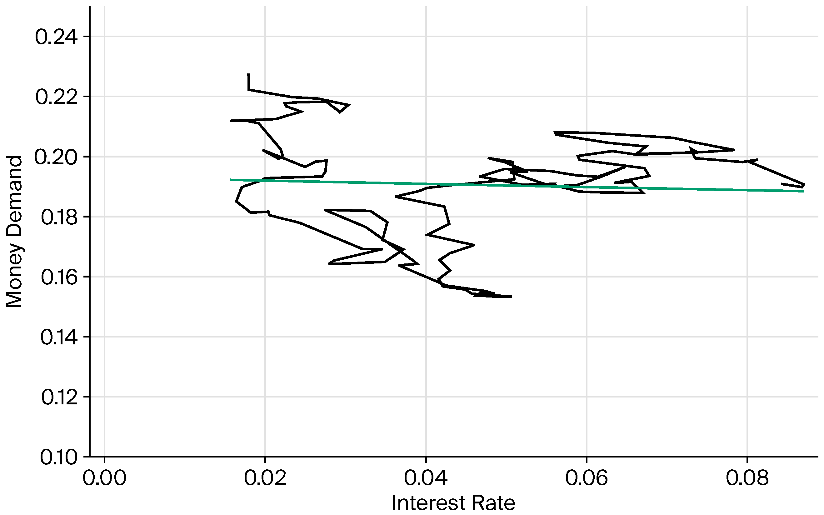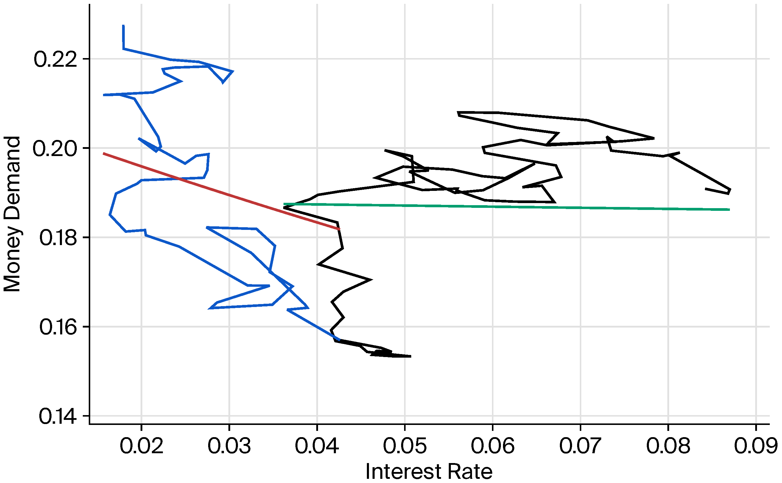 After 2008, the relationship reversed to a conventional negative pattern—as interest rates decreased, money demand increased. The financial crisis created new forces that fundamentally altered this relationship: interest rates fell to historic lows and remained there for years, reducing the opportunity cost of holding money; digital payments and fintech apps became commonplace, changing how people managed liquidity; and central banks injected substantial liquidity through quantitative easing. The stable negative relationship we observed after 2008 thus reflected our seller-side channel working within this new financial environment.