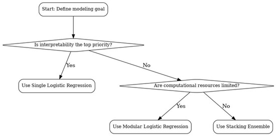 Decision flowchart for selecting between single, modular, and stacking models based on interpretability, resource constraints, and accuracy requirements.