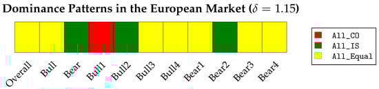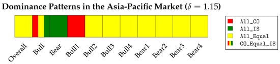 In summary, if we disregard signals arising from very low values of (specifically the European/Bull market scenario at ) and if we also exclude the lower values of in the Asia-Pacific market (because the _IS segment of the CO_Equal_IS pattern occurs only at extremely high confidence levels), then all remaining dominance patterns exhibit significant evidence, with many showing strong or very strong evidence of robustness.