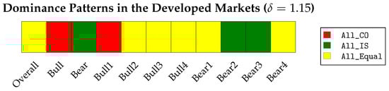 In the Overall period, dominance patterns are highly robust across all markets, with no change in dominance observed at any value of , except in the Canadian and Emerging markets. In the Canadian market, the dominance pattern is All_CO for ranging from 1 to 1.71, beyond which it becomes All_Equal. This corresponds to a one-sided p-value of approximately 4.4%, providing strong evidence in favor of the All_CO dominance. For the Emerging market, the pattern remains All_CO until a transition to All_Equal occurs at , corresponding to a p-value of approximately 2.6%. This indicates very strong statistical evidence supporting the dominance pattern in the Overall period.