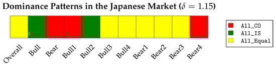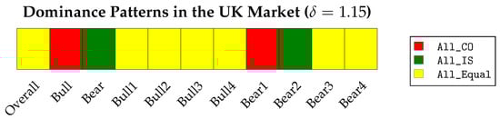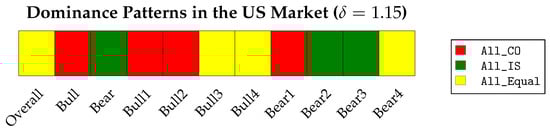 In the Bear regime, transitions occur in the Canadian, Emerging, European, Japanese, and UK markets. In the Canadian, European, and UK markets, the pattern transitions from All_IS to All_Equal at values of 1.32, 1.94, and 1.60, respectively, corresponding to p-values of 9.3%, 2.6%, and 5.5%. These provide significant to very strong evidence of IS dominance, with the strongest support observed in the European market. In the Emerging market, the pattern changes from IS_Equal_CO to All_IS at , with a p-value of 8.7%, supporting the statistical significance of the phase transition. While this p-value is modest, the fact that All_IS dominance persists throughout the entire upper range provides very strong evidence of its robustness. In the Japanese market, the transition from All_CO to All_Equal occurs at , yielding a p-value of 9.9%, again indicating statistical significance.