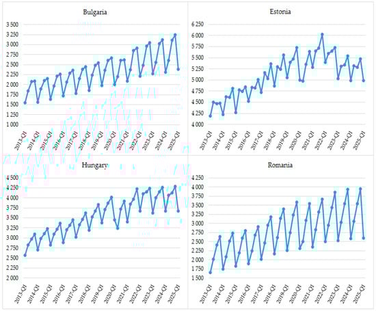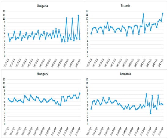 The data presented in Figure 2 indicate that in three of the countries under consideration there is a sustained increase in real GDP per capita for the period from the first quarter of 2013 to the first quarter of 2025. Estonia is the only country where the indicator shows some variability, including a decline since the beginning of 2021. Nevertheless, it is noteworthy that Estonia is distinguished by the highest value of the assessed indicator. Estonia also demonstrates inconsistent dynamics between quarters over the years, while in other analyzed countries, and especially in Romania, significant fluctuations occur between the first quarter of each year and the subsequent quarters.