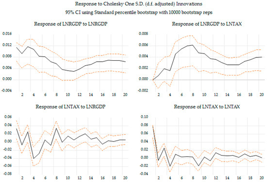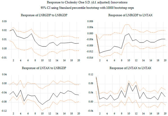 From a research perspective, it is of interest to trace, on the one hand, how economic growth reacts to a shock in the tax burden and, on the other hand, how the tax burden responds to a shock in economic growth. The impulse functions are constructed based on Cholesky one S.D. innovations, and, more specifically, the shock size is one standard deviation. In the Cholesky decomposition, real economic growth per capita is ordered before the tax burden, assuming that growth does not respond contemporaneously to fiscal changes while taxation may react to current economic developments. This recursive structure ensures an economically consistent orthogonalization of shocks and allows for a causal interpretation of the impulse responses. From a temporal perspective, the impulse functions cover a period of 20 quarters (5 years), which allows for the tracing of both short-term and long-term effects due to one-off shocks in economic growth and tax burden. In addition, when using a longer period of time, it is possible to identify effects that are difficult to detect in the short-term. To assess the statistical reliability of the impulse response functions, a bootstrap procedure with 10,000 replications is applied. Since the distribution of the impulse responses is not analytically known, the bootstrap method provides an empirical approximation by repeatedly resampling the residuals and re-estimating the model. Confidence intervals are constructed using the standard percentile approach, which yields stable and consistent estimates for large samples and in the absence of strong nonlinearities, while avoiding the computational burden associated with bias-corrected or studentized bootstrap variants.