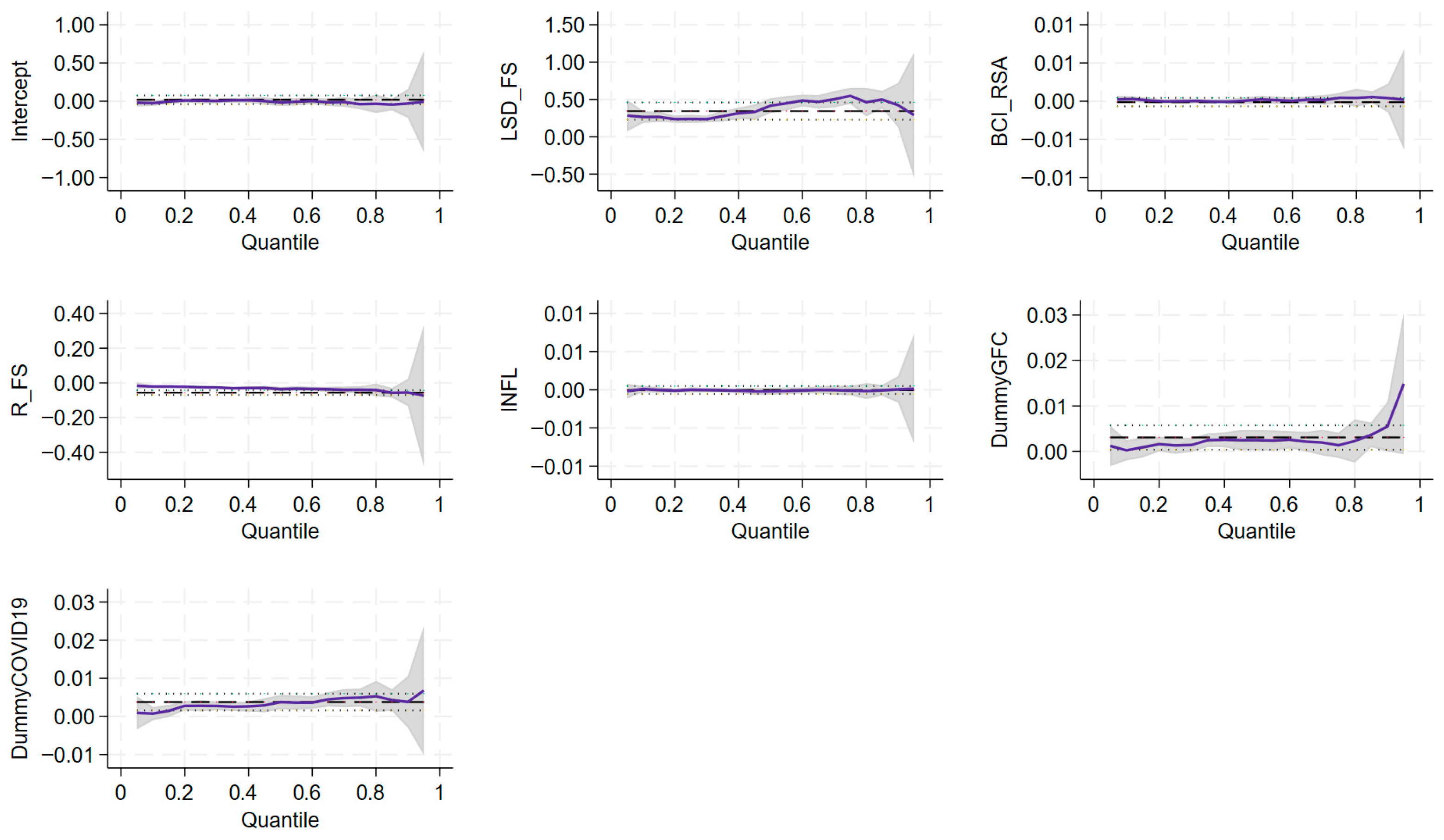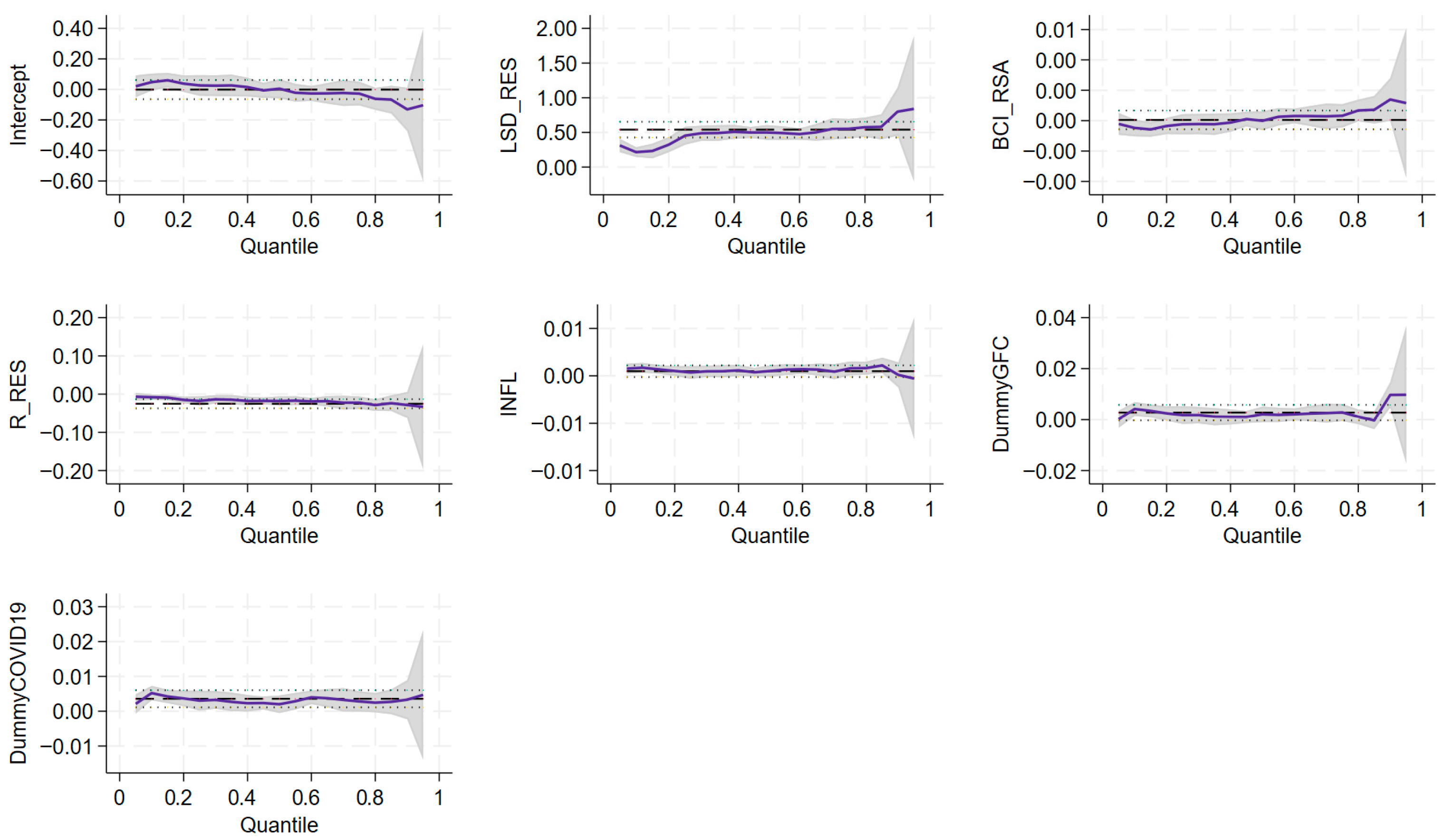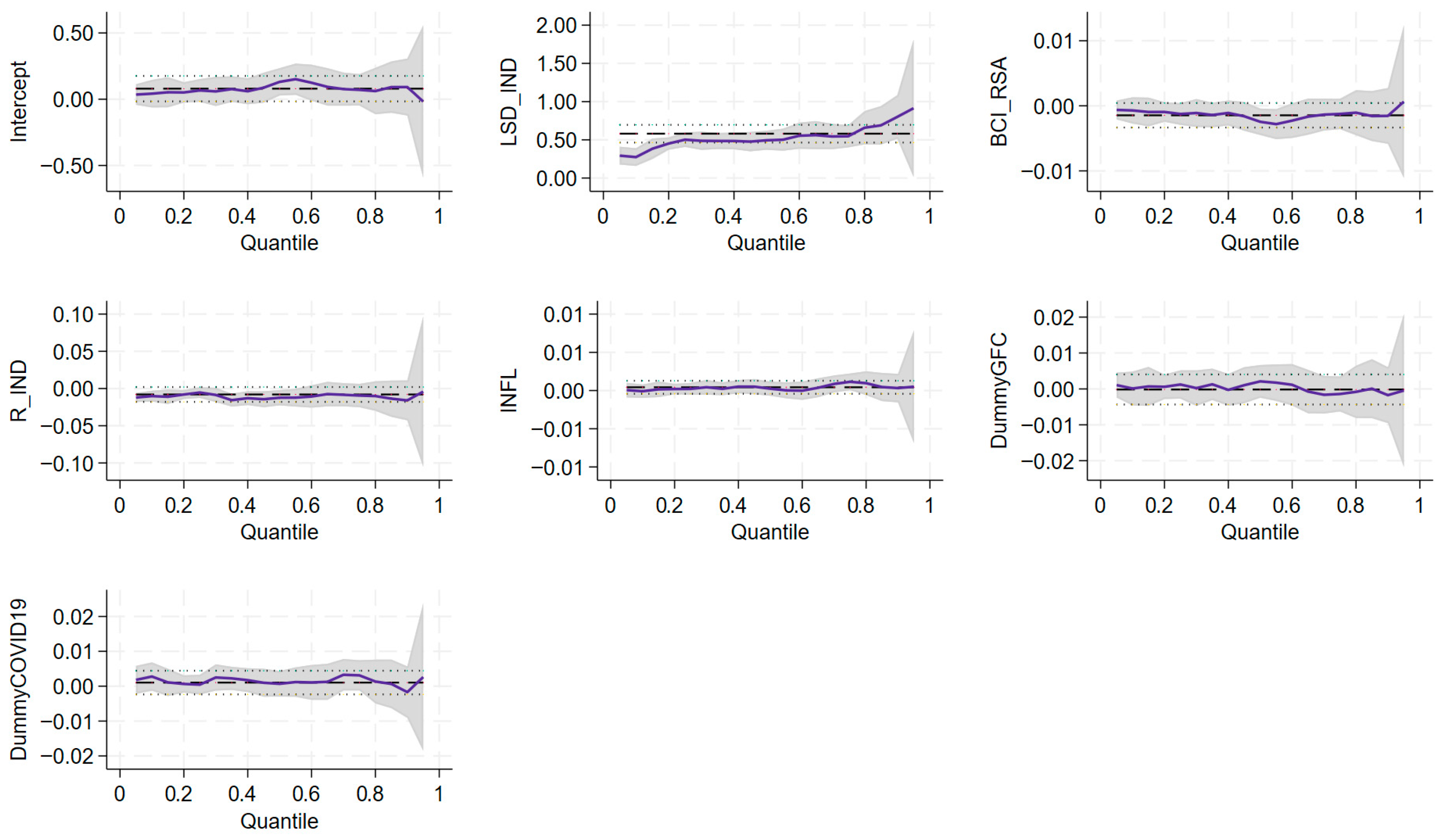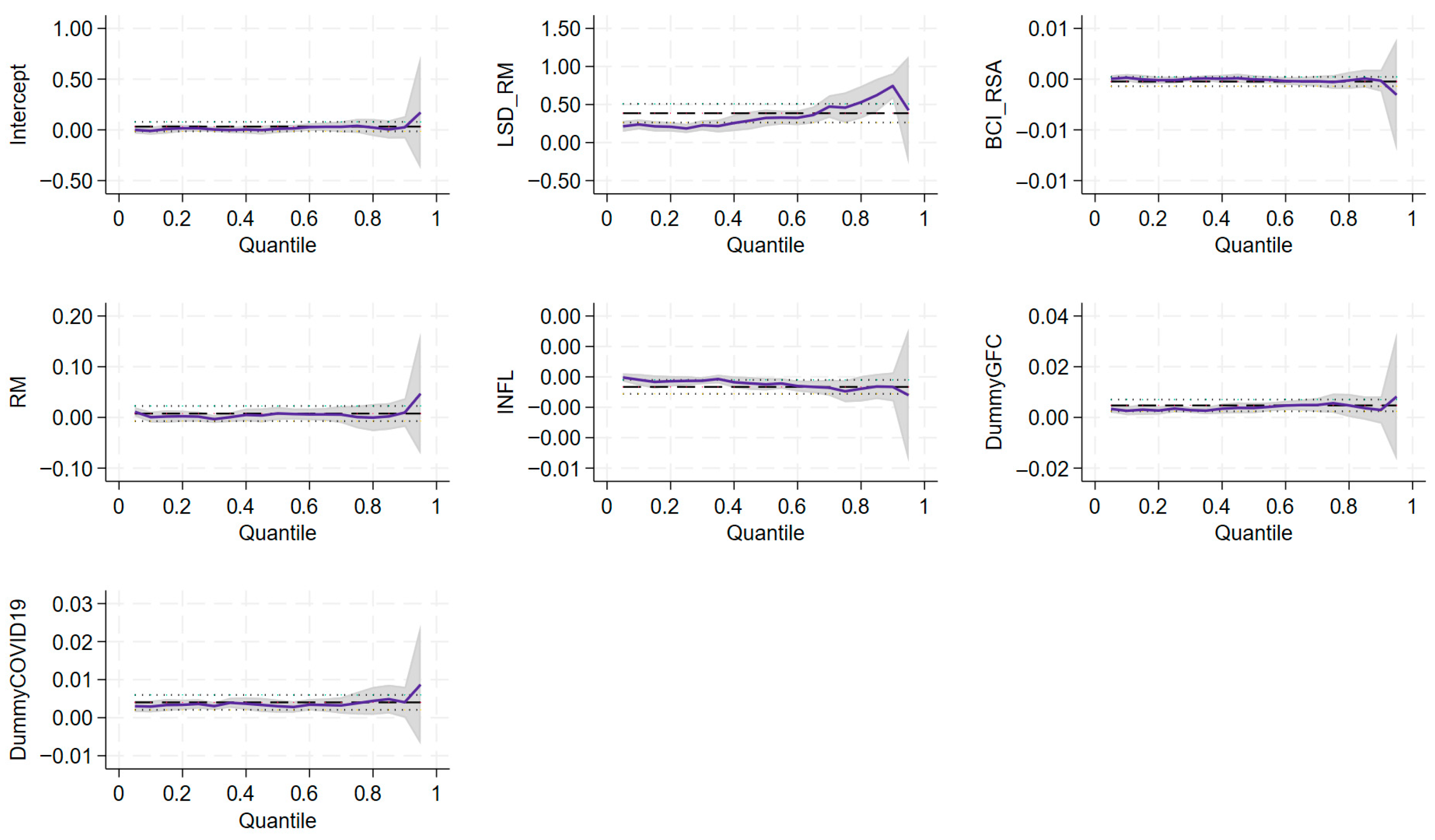 p-value = 0.035), indicating that the BCI coefficients were heterogeneous across quantiles. Thus, the Business Confidence Index (BCI_RSA) demonstrates a positive and statistically significant effect on volatility, particularly in the Lower and higher quantiles (e.g., 0.00942 at Q0.25 and 0.0286 at Q0.75). This implies that business sentiments have a stronger impact during periods of higher market returns and volatility. The result aligns with
