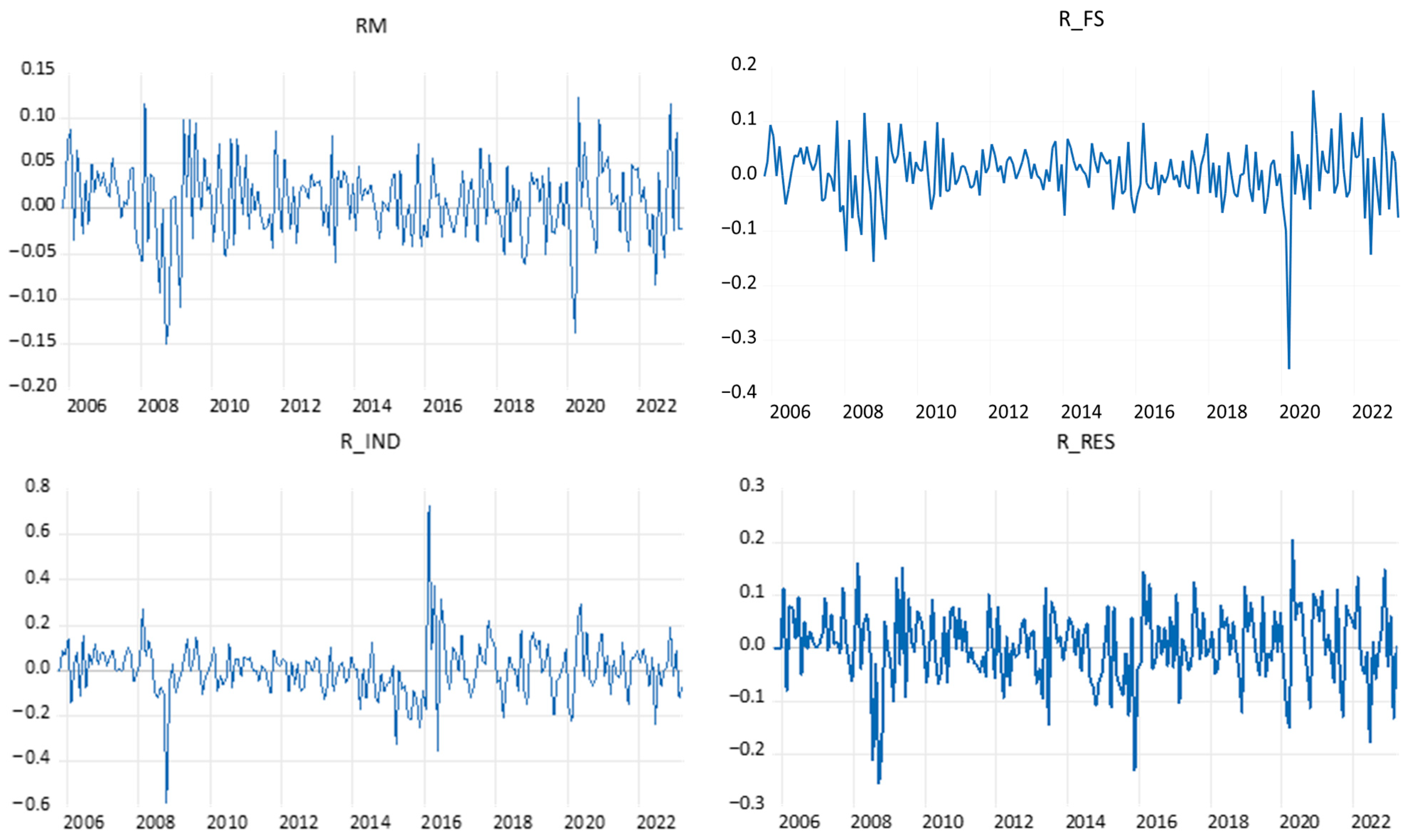 Appendix B reveals a positive relationship between BCI and sectoral returns, suggesting sentiment-driven performance effects, and a negative association between volatility and returns, consistent with the risk–return trade-off. Crisis dummies correlate positively with volatility, reflecting heightened market stress during the GFC and COVID-19 periods.