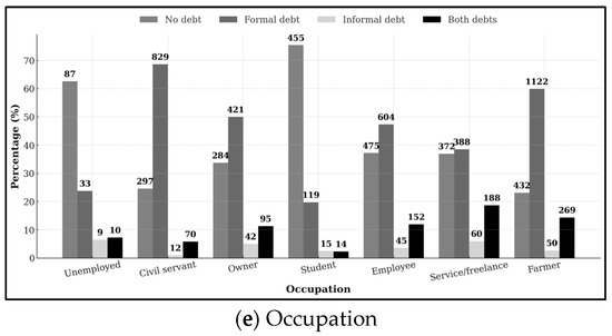 p-value = 0.000). Civil servants exhibit the highest share of formal borrowing (68.6 percent), reflecting the advantages of stable employment, predictable income streams, and easier access to institutional credit. In contrast, students show very limited debt participation, with more than three-quarters reporting no debt—consistent with their life-cycle stage, where income is minimal and financial dependence remains high. Meanwhile, farmers and self-employed or freelance workers display the highest exposure to both formal and informal debts, underscoring their economic precarity and limited access to secure financial channels. This dual borrowing pattern highlights how occupational instability often pushes individuals toward informal credit markets to manage liquidity and seasonal income fluctuations.