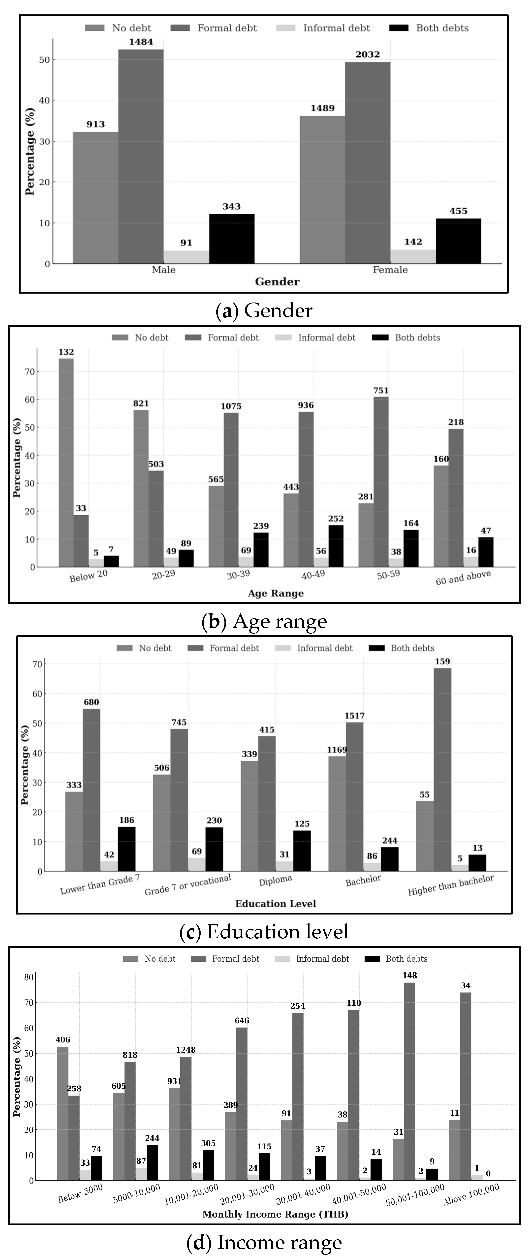 p-value = 0.000). Individuals holding bachelor’s degrees or higher report the largest share of formal debt—around 50 to 69 percent—reflecting their greater financial awareness, access to credit information, and stronger links to regulated financial institutions. By contrast, those with less than a Grade 7 education still participate in formal borrowing to a considerable extent (about 54.8 percent), yet a meaningful proportion of them also hold both formal and informal debts (roughly 15 percent). This mixed borrowing behavior suggests that while education facilitates entry into formal credit markets, limited financial stability among lower-educated groups may still compel them to rely on informal lending networks to smooth consumption or cope with income volatility. Such a pattern underscores the persistence of financial inequality in Thailand’s credit environment.