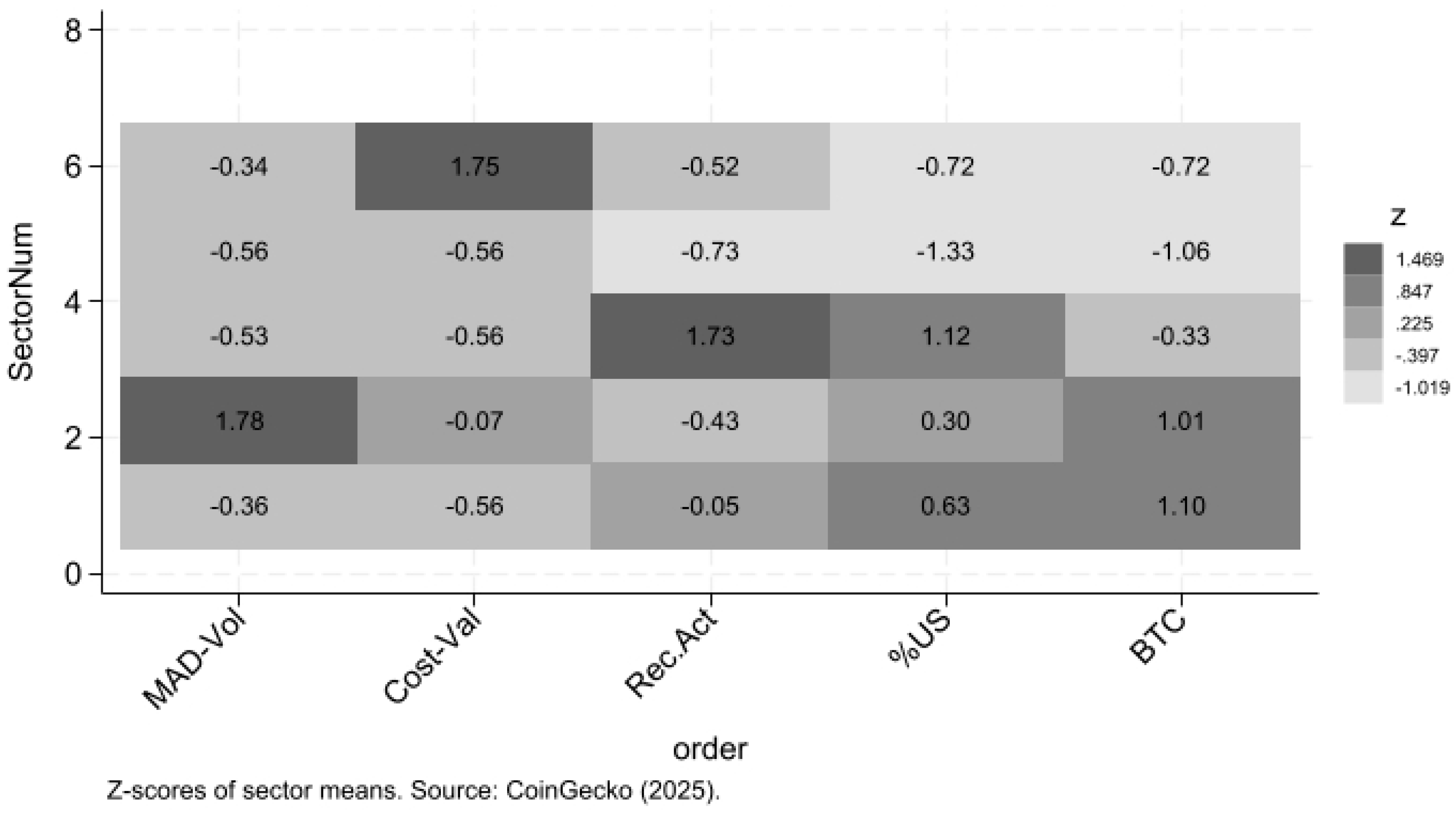 Table 6 reports aggregated sector-level metrics. The table presents raw mean values (before z-score standardization) for MAD-based volatility, cost-value ratio, recent transactional activity (last 30 days), U.S. regulatory dummy, and total Bitcoin holdings across the 102-firm sample. Technology records the highest mean total Bitcoin (23,312 BTC) and cost-value ratio (463.15), reflecting Strategy’s dominant position. Cryptocurrency mining exhibits the highest recent activity (219 transactions) despite negative volatility values linked to operational cost structures. Retail and e-commerce sectors show limited scale (mean holdings of 5392 BTC and 4710 BTC, respectively), while healthcare displays the lowest volatility proxy (−31.55) due to conservative treasury strategies. The Others category captures heterogeneous firms with substantial aggregate holdings (133,055 BTC). These unstandardized metrics are subsequently transformed into z-scores for