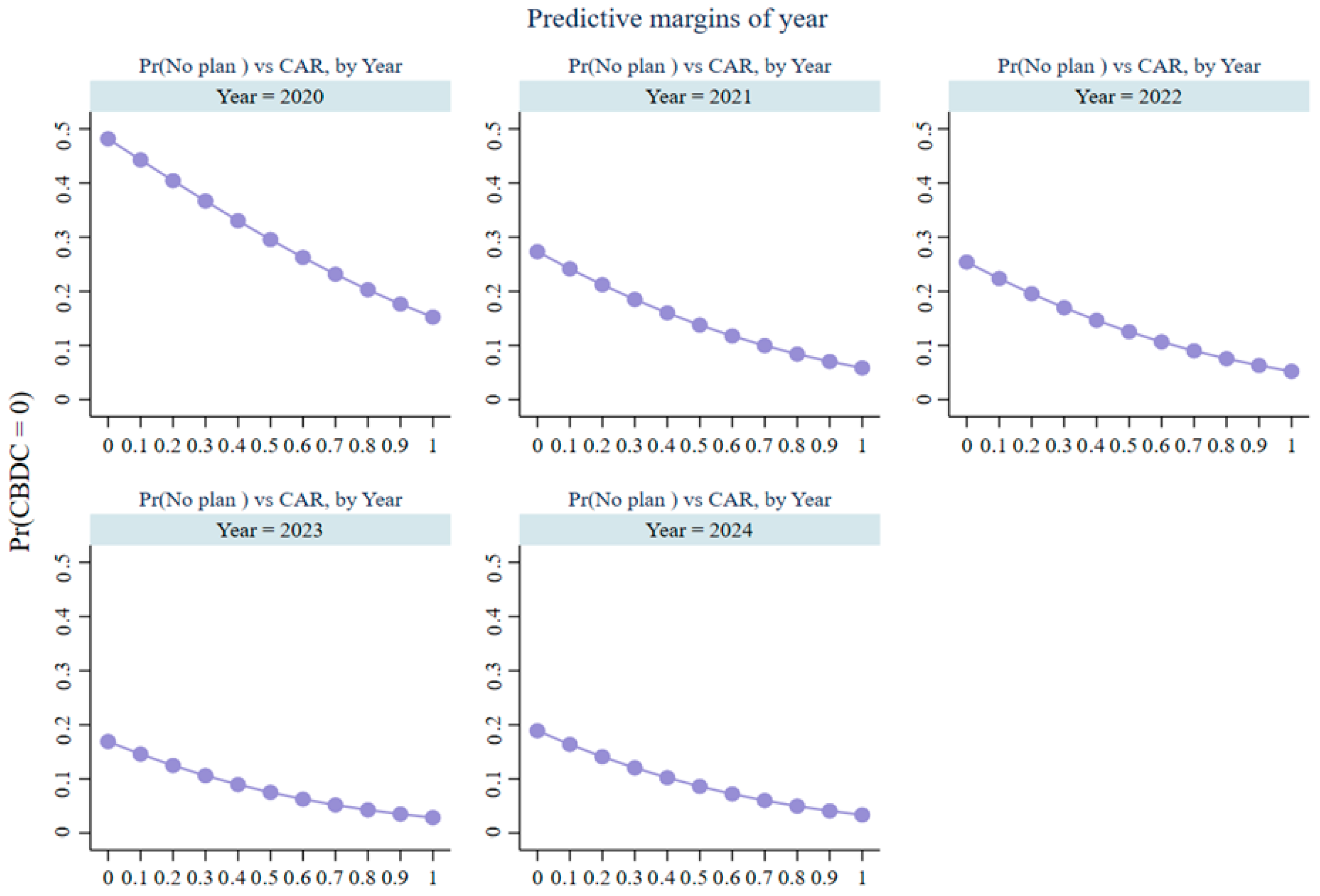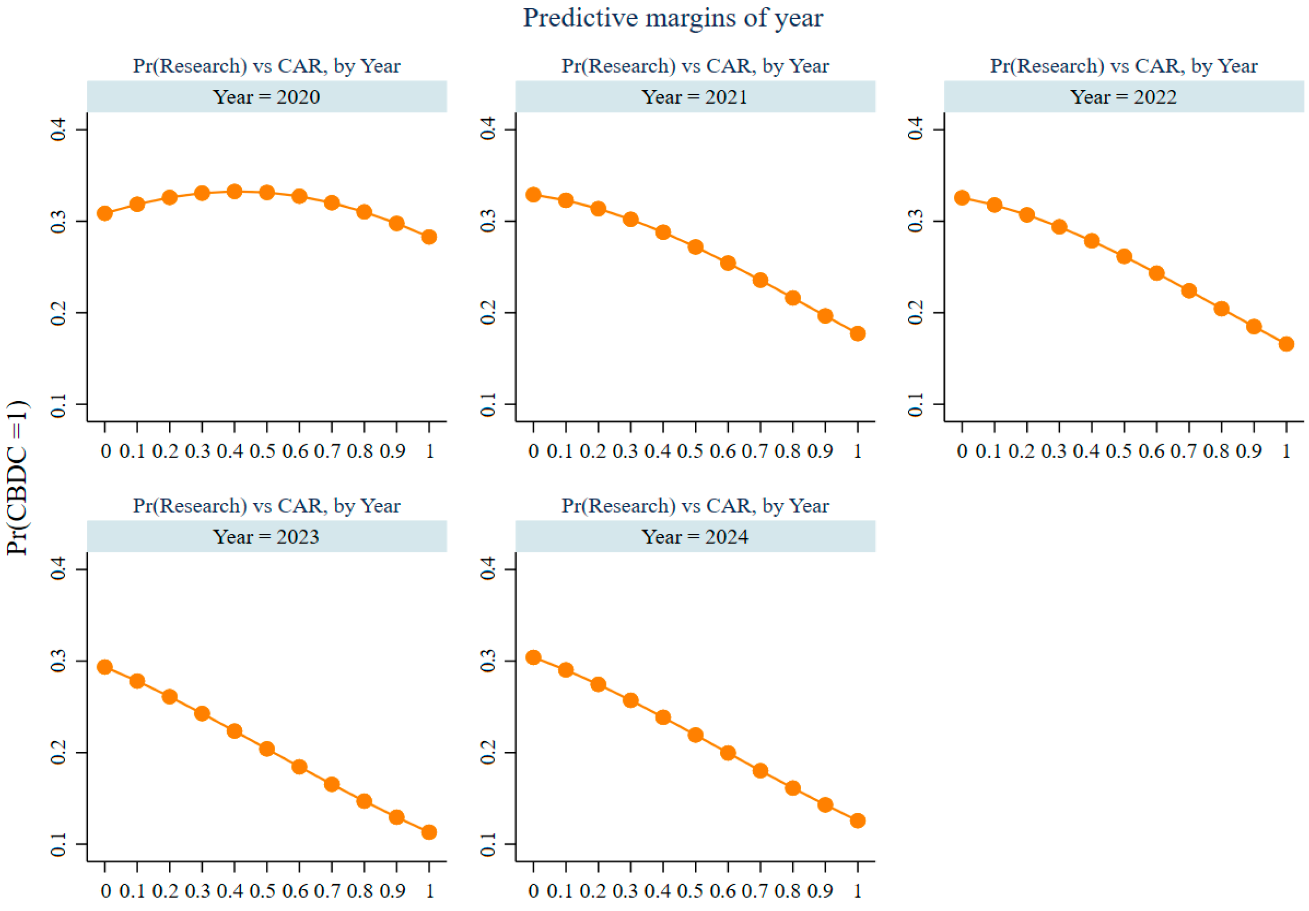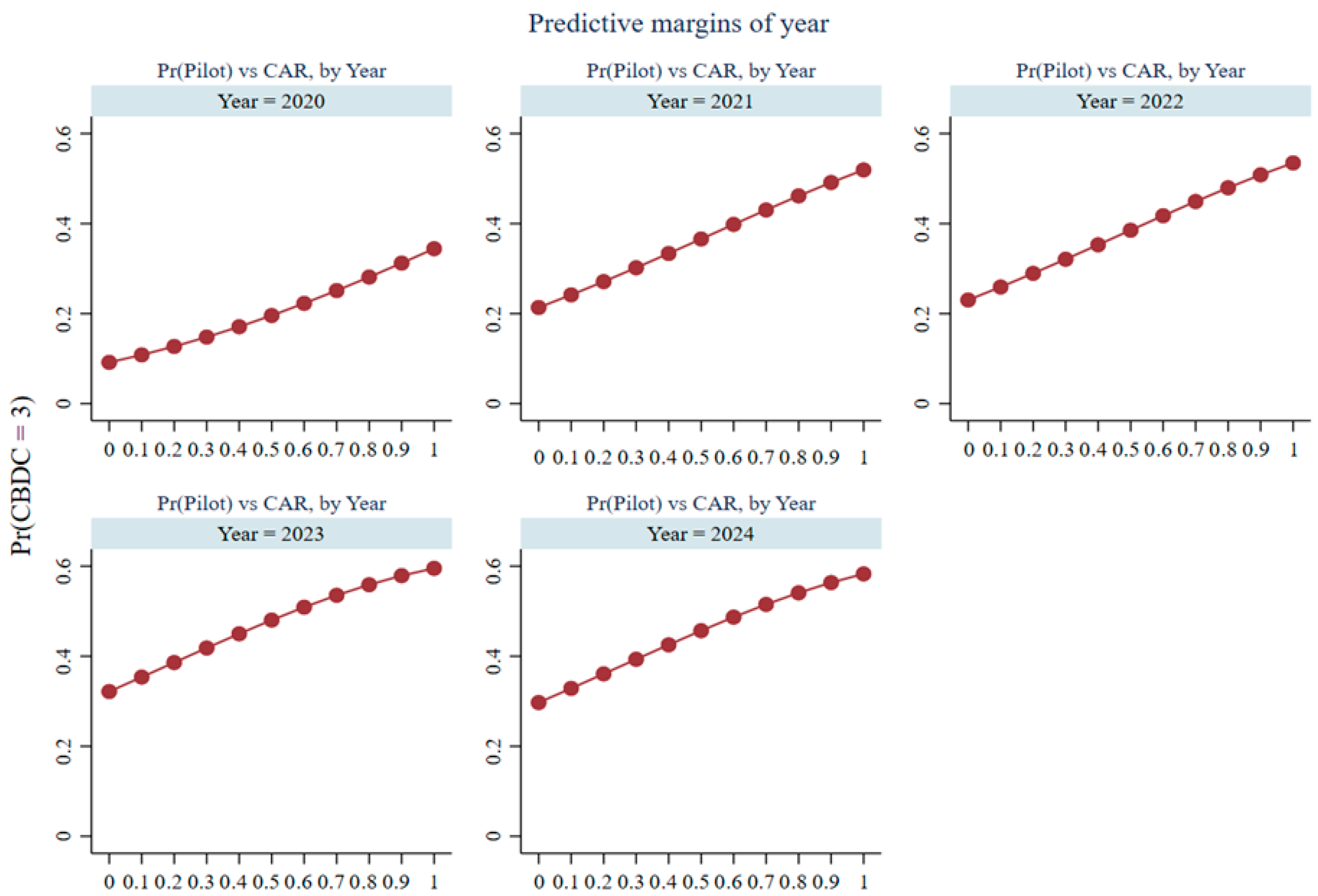 Given the ordinal nature of the dependent variable, the core analysis employs ordered logistic regressions. This model estimates the probability of a country being in a particular CBDC stage or below, conditional on CAR and controls (Cameron & Trivedi, 2005).