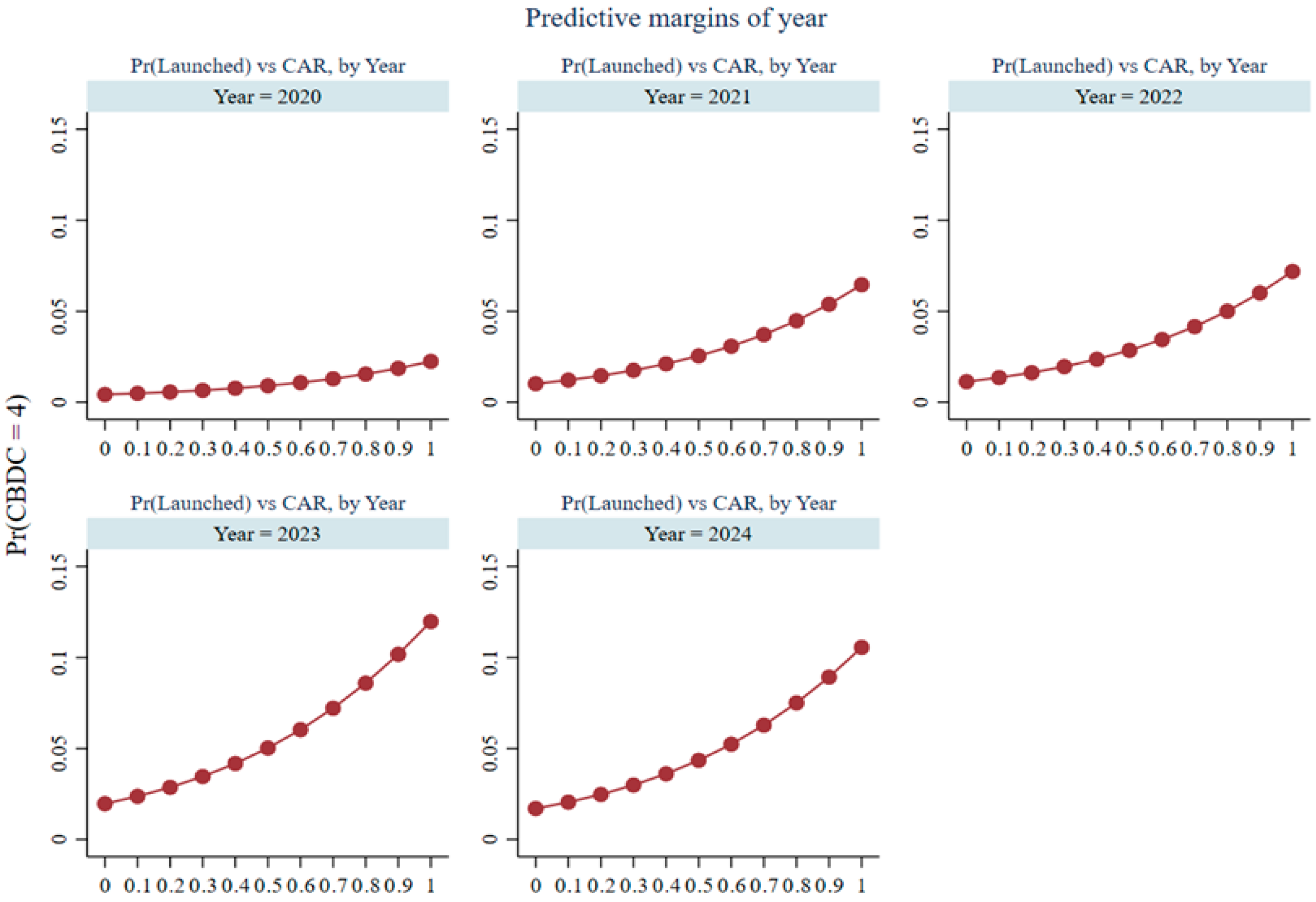 Overall, the results demonstrate a strong and robust association between cryptocurrency adoption and CBDC development, providing support to our hypothesis 1 (H1). The persistence of CAR’s significance across different specifications, even after accounting for country and year fixed effects, lends credibility to the argument that rising cryptocurrency use is an important catalyst pushing central banks to accelerate their digital currency initiatives.