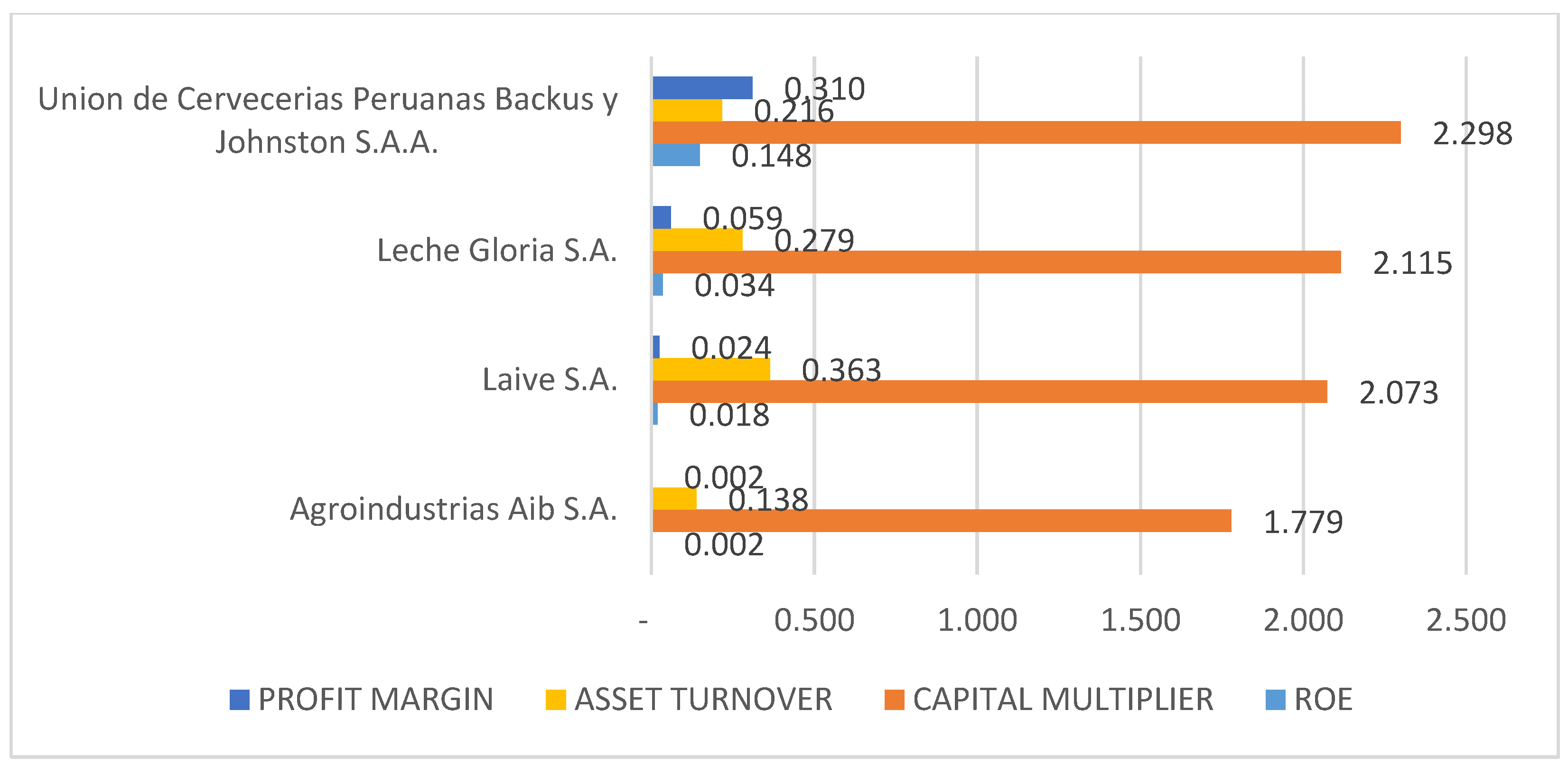 Profitability analysis using the DuPont method revealed that Backus has the highest profit margin (0.319), while Agroindustrias Aib has the lowest (0.002). Laive leads in asset turnover efficiency (0.363) and Backus in capital multiplier (2.298), although the latter is below the sector average (7.4% in 2022, according to Ready Ratios). These results are consistent with