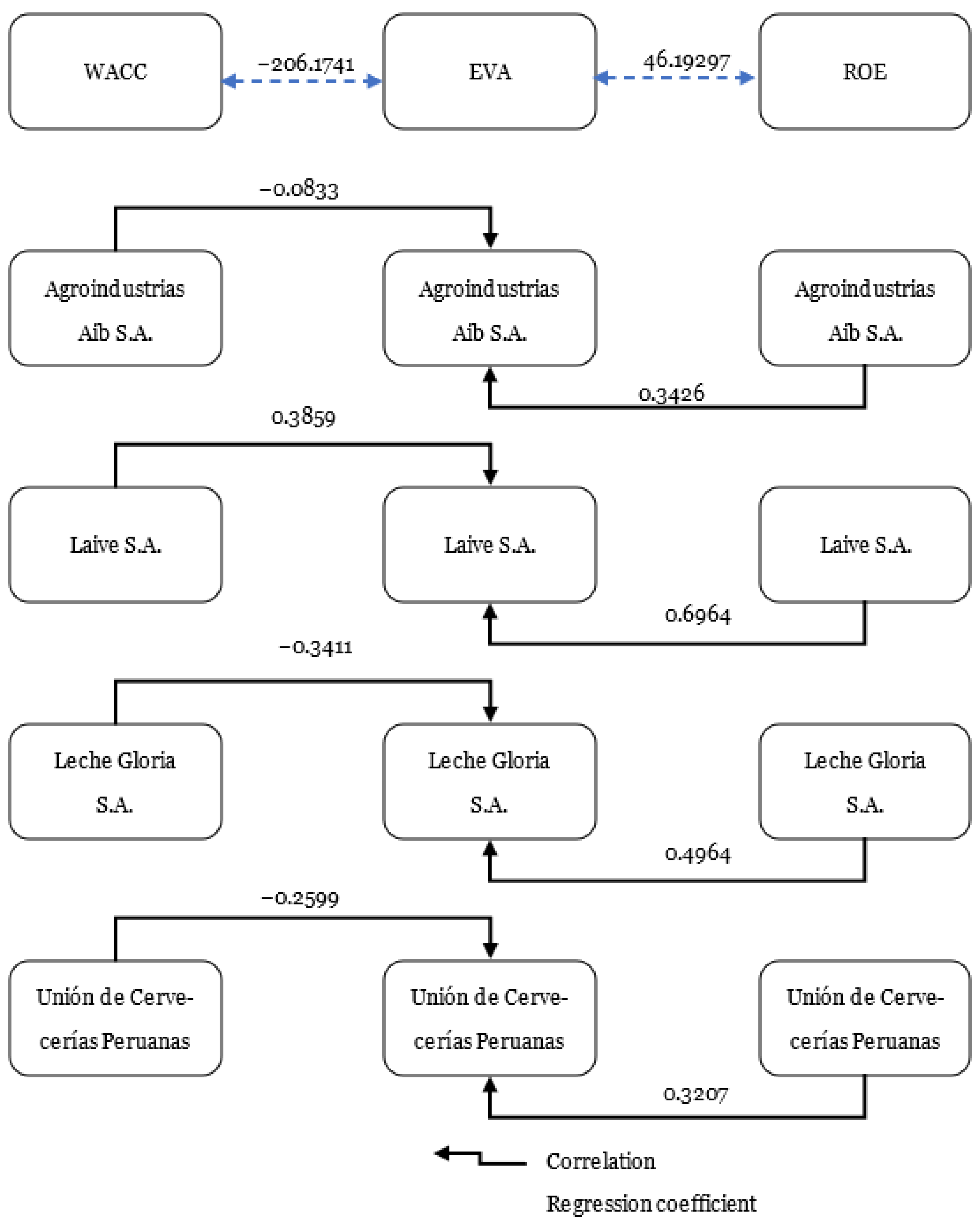 Finally, it is observed that Agroindustrias Aib, Leche Gloria, and Backus generate economic value by presenting a ROIC higher than the WACC (0.47% vs. 0.27%, 4.10% vs. 2.79%, and 6.18% vs. 3.57%, respectively). In contrast, Laive S.A. shows a ROIC lower than the WACC (2.69% vs. 3.06%), indicating value destruction. These results support the theory that a ROIC higher than the WACC reflects efficient management of invested capital and contributes to the creation of economic value.