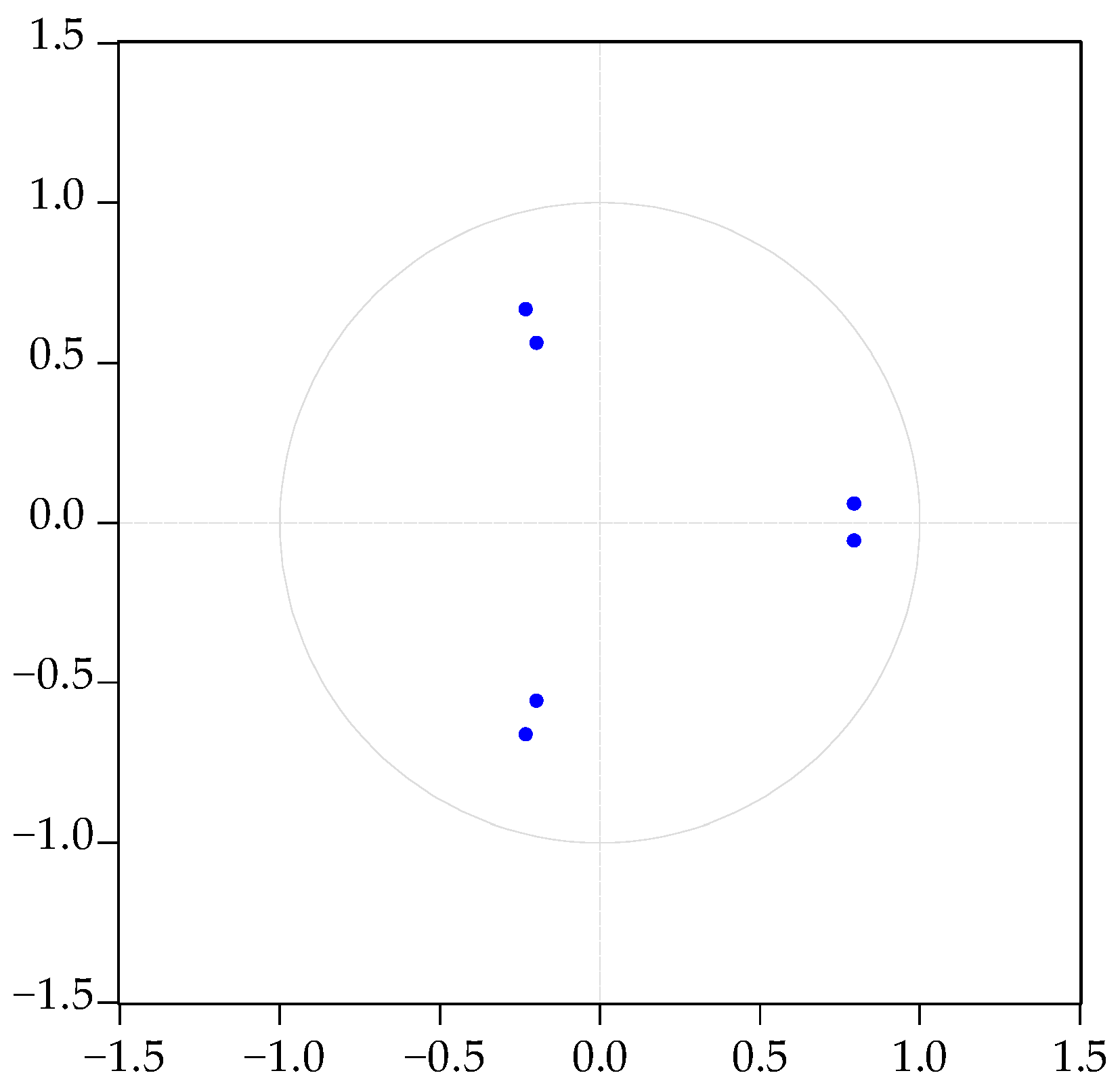 Figure 1, all inverse roots lie within the unit circle, confirming that the model is dynamically stable. Second, the Lagrange Multiplier (LM) test is applied using two formulations. The first tests the null hypothesis of no serial correlation at a specific lag h, while the second tests the joint null hypothesis of no serial correlation from lag 1 to h. As reported in