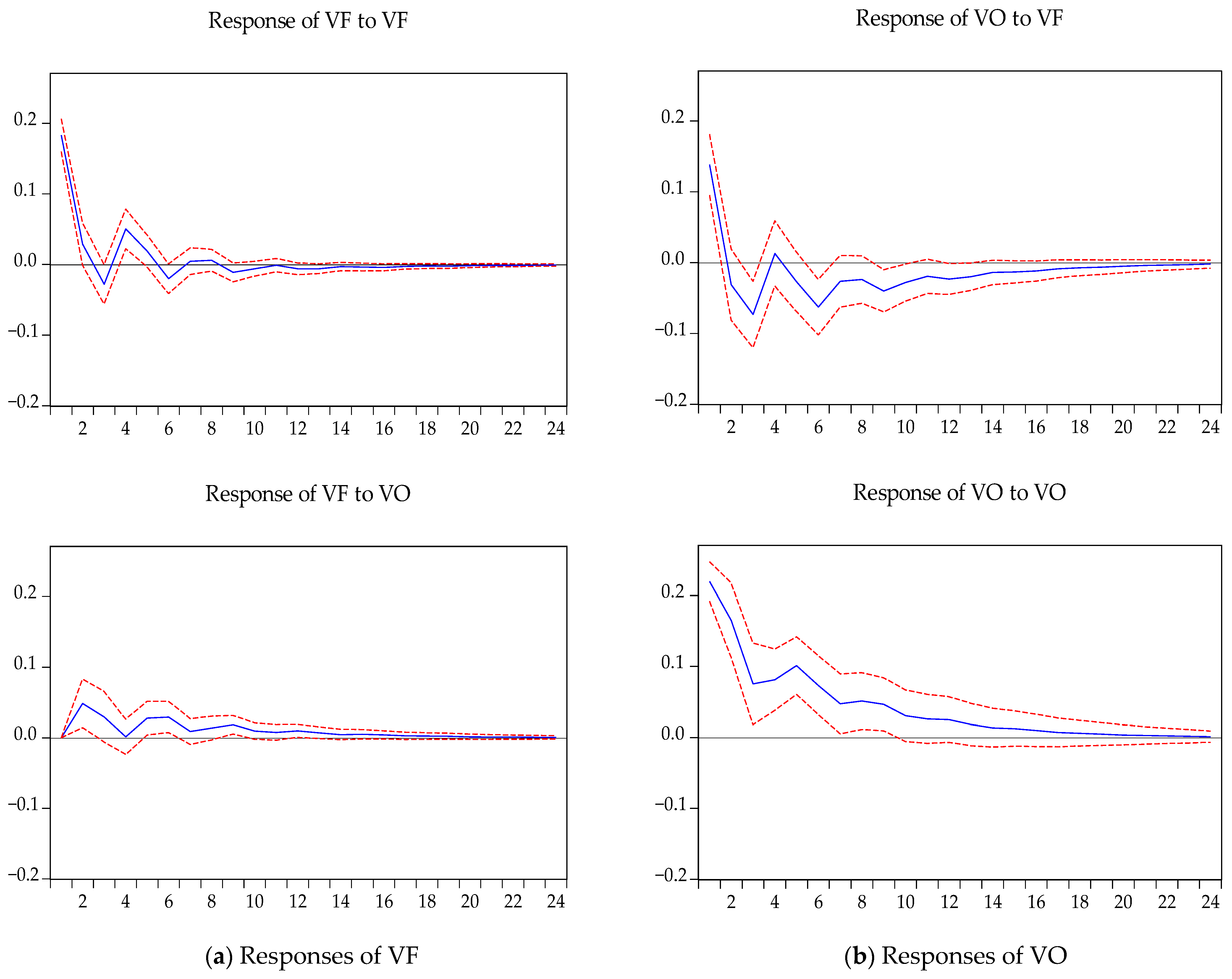 Figure 2). Panel A focuses on responses involving VF. The response of VF to its own shock is positive and high in the first month, then declines rapidly and turns negative by the third month, indicating a short-lived positive impact followed by a correction. The response of VF to a shock in VO begins at zero in the first month, turns positive in the second month, and fluctuates within the positive range for several months before gradually returning to zero. This pattern suggests a delayed but sustained positive influence of options trading on futures volume. Panel B shows the corresponding responses for VO. The reaction of VO to its own shock is strong and positive initially, then declines more gradually and steadily approaches zero over the 24-month horizon, suggesting a slower adjustment in options trading activity compared with futures. In contrast, the response of VO to a shock in VF begins with a strong positive reaction in the first month, turns negative in the second month, and remains negative for several months before gradually approaching zero. This reversal indicates that the longer-term impact is negative, possibly reflecting shifting trading strategies or portfolio rebalancing away from options following periods of intense futures activity. Therefore, the results of the impulse response analysis are consistent with the sign results from the VAR(3) model.