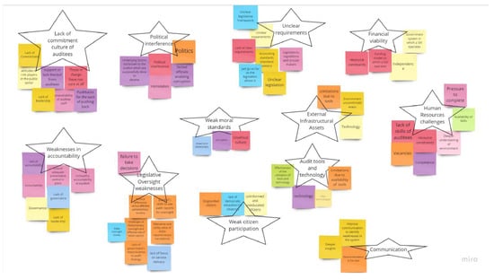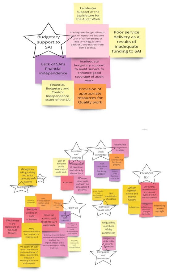 Conventional qualitative research generally recommends 6 to 10 participants in a focus group (De Vos et al., 2009; L. Cohen et al., 2011; Rule & John, 2011); however, according to Northcutt and McCoy (2004), an 8-to-12-member participation is required in an exploratory focus group—as the process does not inspire oral discussion—so as to lessen the likelihood of bias by domineering personalities. However, there is a propensity for participants to be disengaged, or their voices may not be heard in the focus group with many participants (Wyatt, 2010). Hence, during the focus group phase, the constituents’ opinions, insights, and experiences regarding the phenomenon being studied are explored via silent brainstorming to generate data. In this study, the focus group discussions were conducted via an online platform, using the Miro application to simulate the notecards and Zoom for the meeting, as online voice-based group discussions are prevalent in qualitative research (Gray et al., 2020; Lathen & Laestadius, 2021). The researchers gathered information or data in accordance with compliance-approved protocols to ensure trustworthiness. Following the authorisation of heads of SAIs in Ghana, Sierra Leone, and South Africa, three separate online focus groups were conducted in July through to August of 2022. These SAIs were chosen according to their usefulness, readiness to take part in the study, significant ranking position in the global project on SAI independence, and the authors’ convenience. The participants were leading managers with experience and proficiency in public sector accounting and auditing. A consultant and an authoritative psychologist led the focus groups to guard against researchers’ bias. System links were initially sent to the constituents via their email addresses, allowing them to sign up on the online platform. Commencing with the session, the constituents were asked to regulate their thoughts to a state of tranquillity and percipience (Northcutt & McCoy, 2004). They were then requested to reflect on their experiences regarding influences on effective auditing in the public sector, in silence. Towards the deconstruction and operationalisation of the research question, an issue statement on the phenomenon was initiated by the facilitator, as suggested by Mampane and Bouwer (2011), to initiate reflection. Thus, the constituents spent about 45 min quietly, following a brief discussion of the issue statement, reflecting on their experiences, and then typing their reflections on the notecards, with the aid of the Miro application whiteboard, to formulate the factors that influence effective auditing in the public sector. The number of notecards each constituent could place on the whiteboard had no limit; however, only one thought or experience per card was allowed—using words, phrases, and sentences. The task of the facilitator was strictly to guide the process and encourage the constituents to write without suppressing their thoughts, until they exhausted their ideas (Northcutt & McCoy, 2004, p. 69). Once every constituent was finished writing, notecards representing the factors were randomly displayed on the Miro application whiteboard. These individual ideas represented sub-factors. The cards were then grouped into comparable themes, and a discussion ensued to ensure that all participants agreed on the categorisation of the note cards. The participants then enhanced the sub-factor category and assigned a designation (factor). The purpose of recording the factor discussions was to document the participants’ interpretations of each factor. Data minimisation and retention were the outcomes of the first session, which is a good strategy for distilling meaning from vast volumes of data. The facilitators compiled a summary record of the factors for expanded analysis by the participants. The expanded analysis by the participants with the help of researchers resulted in reclassification and consolidation of identified factors (the expanded data analysis can be made available upon request). Represented in Figure 2 is the initial stage of formulating fundamental factors and sub-factors that influence government auditors or public sector auditing by focus group 2 participants. The participants of focus groups 1 and 3 also formulated several factors and sub-factors.