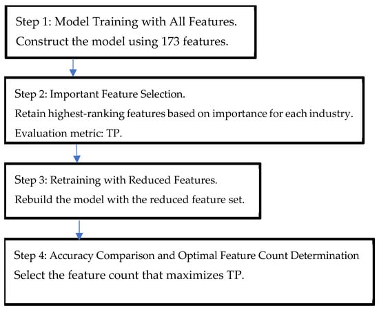 The feature selection process follows a wrapper-based approach involving iterative model training and evaluation based on the true positive (TP) count and recall to identify the optimal number of features for each industry category. The procedure is summarized as follows: