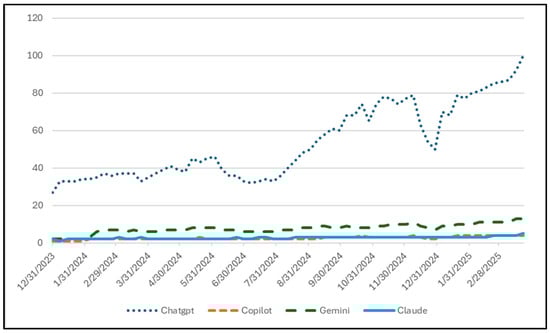 Total Web Searches for ChatGPT and its Alternatives. Source: Authors’ chart based on the Google trends using “search term” for each word. To reproduce this chart, please first type “ChatGPT”, in where it says, “Add a search term” in Google trends. Next, enter “Copilot”, “Gemini”, and “Claude” where it says “+Compare” one at a time. This process will plot the searches for all these terms in a single chart. The time period for the search is 31 December 2023–23 March 2025, and the relevant geography for the search is “Worldwide”.