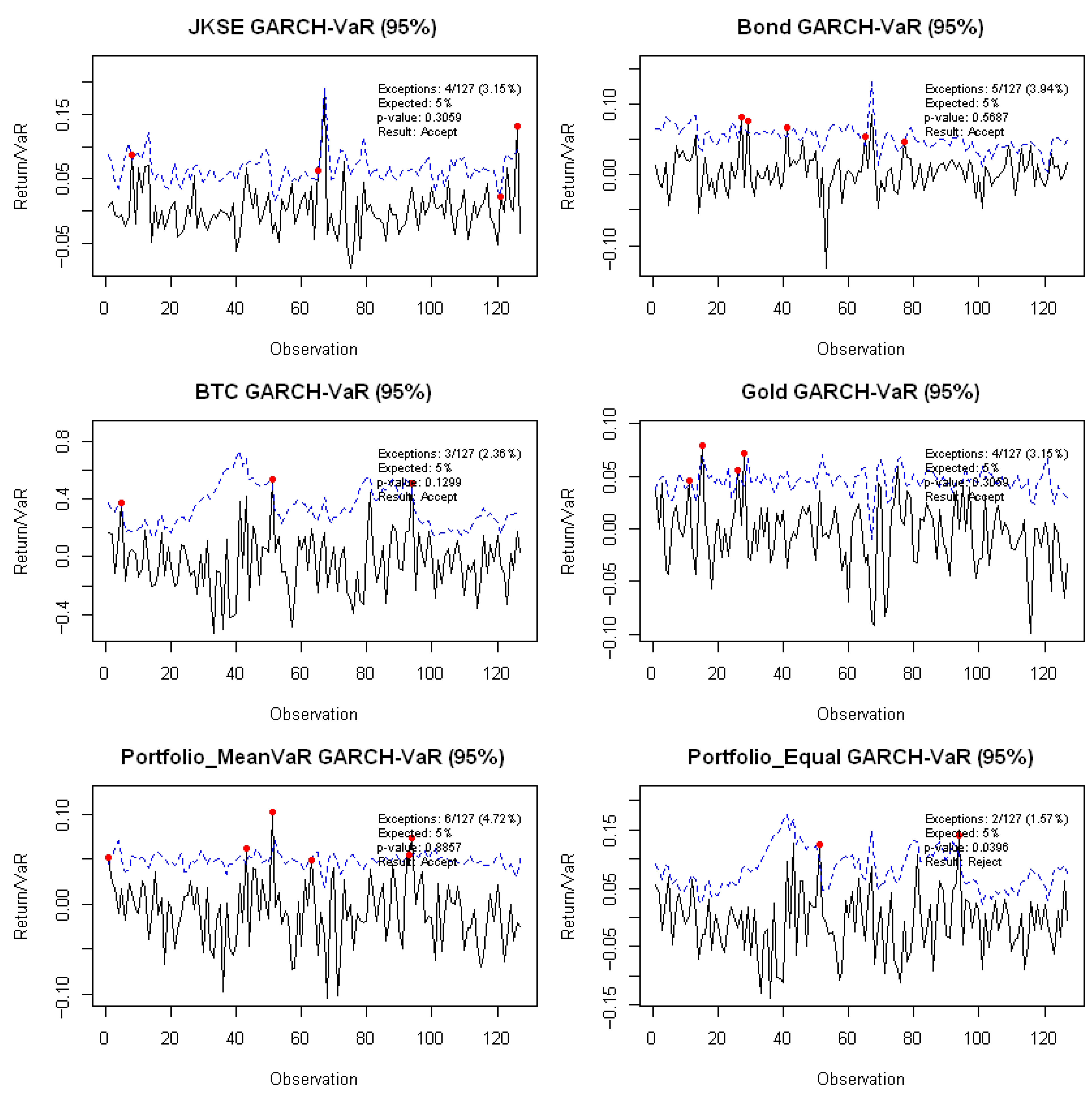 - The Kupiec test, also known as the Proportion of Failures (POF) test, evaluates whether the observed exception rate is statistically consistent with the expected confidence level . The test is formulated as a likelihood ratio test:where represents the number of observed VaR exceptions and denotes the total number of observations in the testing period then is the empirical exception rate. Under the null hypothesis that the true probability of exceptions equals , the test statistic follows a chi-squared distribution with one degree of freedom. The null hypothesis is rejected at the significance level (commonly 5%) if , indicating that the VaR model is misspecified. The confidence level used in this study is 95%, based on the Kupiec Test, where the number of exceedances must be less than or equal to 0.05. If the p-value exceeds 0.05, the null hypothesis H0 is accepted, indicating that the VaR model is valid; conversely, if the p-value is less than or equal to 0.05, the alternative hypothesis H1 is accepted, implying that the VaR model fails to demonstrate portfolio robustness against systematic factor fluctuations.