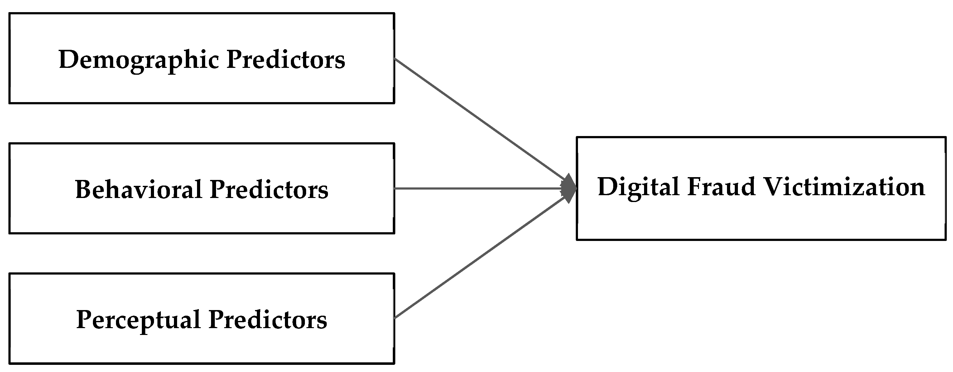 Figure 1 presents the conceptual framework illustrating the multidimensional predictors of digital fraud victimization, integrating demographic, behavioral, and perceptual determinants within a coherent theoretical structure.