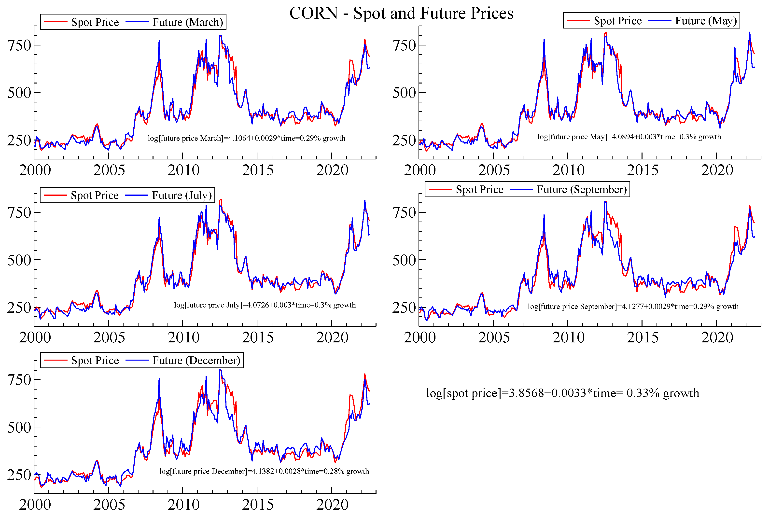 Corn—Spot and Future Monthly Prices. The figure shows the monthly time series of corn spot prices (red lines) and futures prices (blue lines) across five contract maturities (March, May, July, September, and December), and the estimation of growth equations for each contract to analyze price dynamics. Source: Authors’ elaboration from BarChart database.