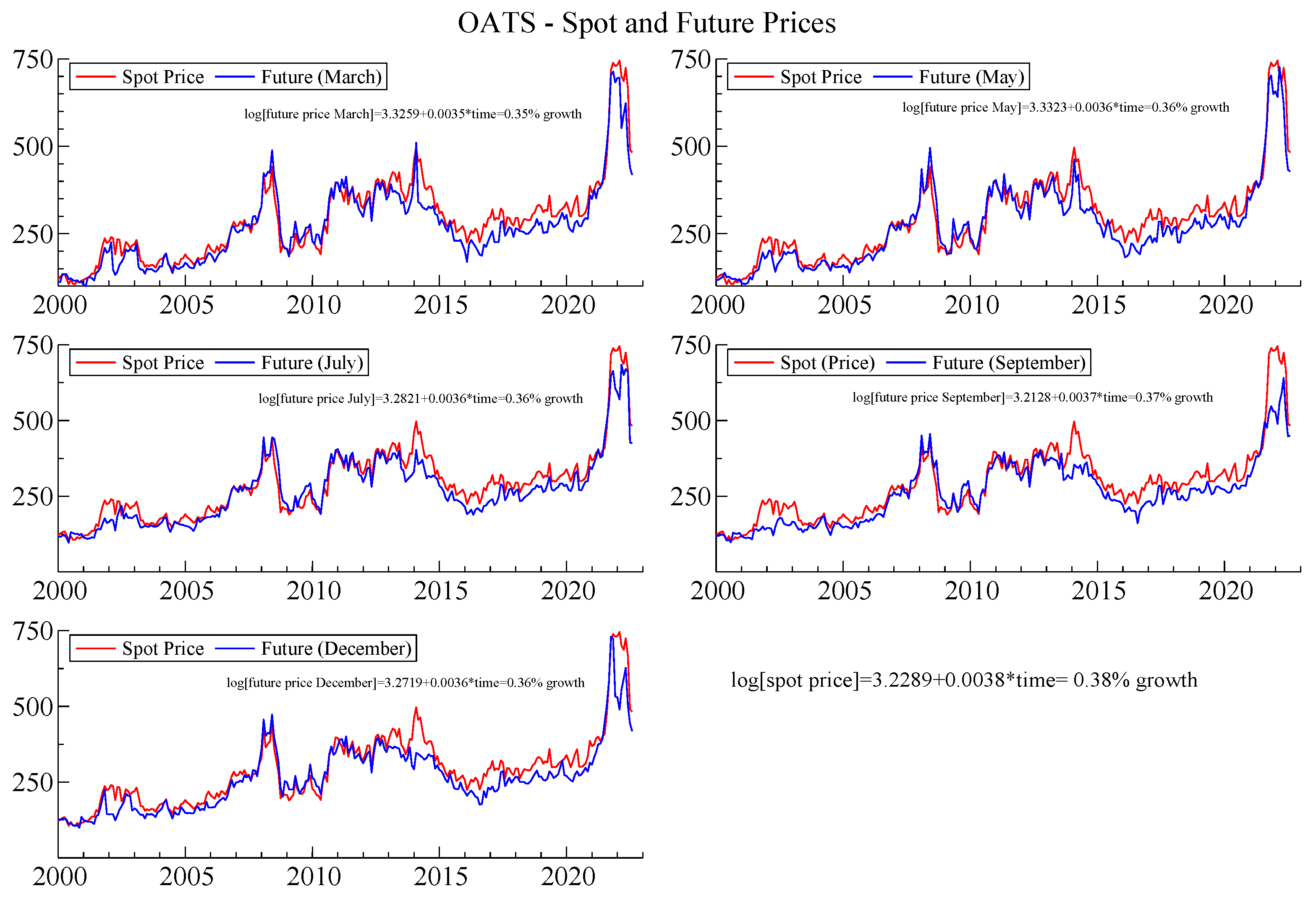 Oats—Spot and Future Monthly Prices. The figure shows the monthly time series of oats spot prices (red lines) and futures prices (blue lines) across five contract maturities (March, May, July, September, and December), and the estimation of growth equations for each contract to analyze price dynamics. Source: Authors’ elaboration from BarChart database.