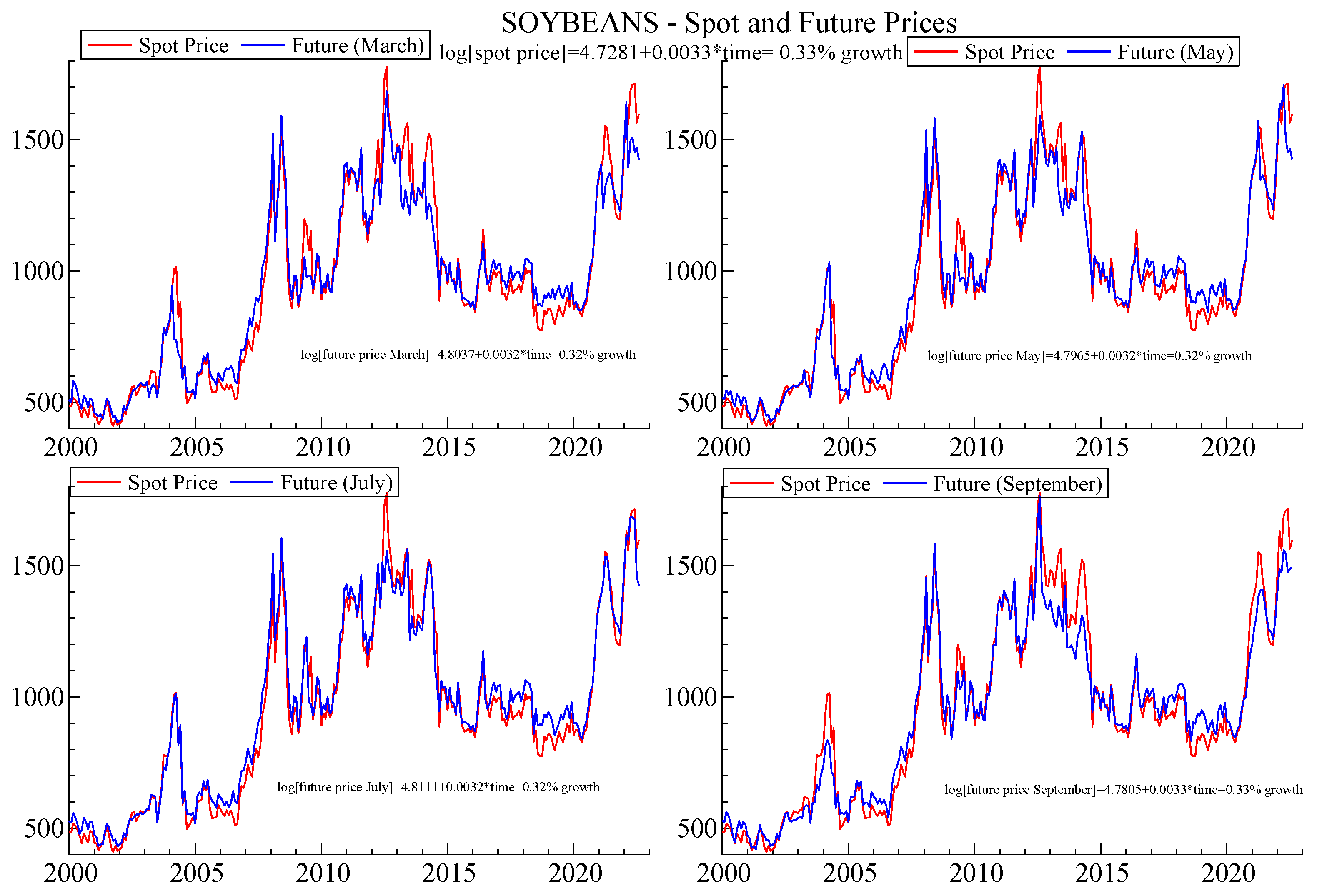 Soybeans—Spot and Future Monthly Prices. The figure shows the monthly time series of soybeans spot prices (red lines) and futures prices (blue lines) across five contract maturities (March, May, July, September, and September), and the estimation of growth equations for each contract to analyze price dynamics. Source: Authors’ elaboration from BarChart database.