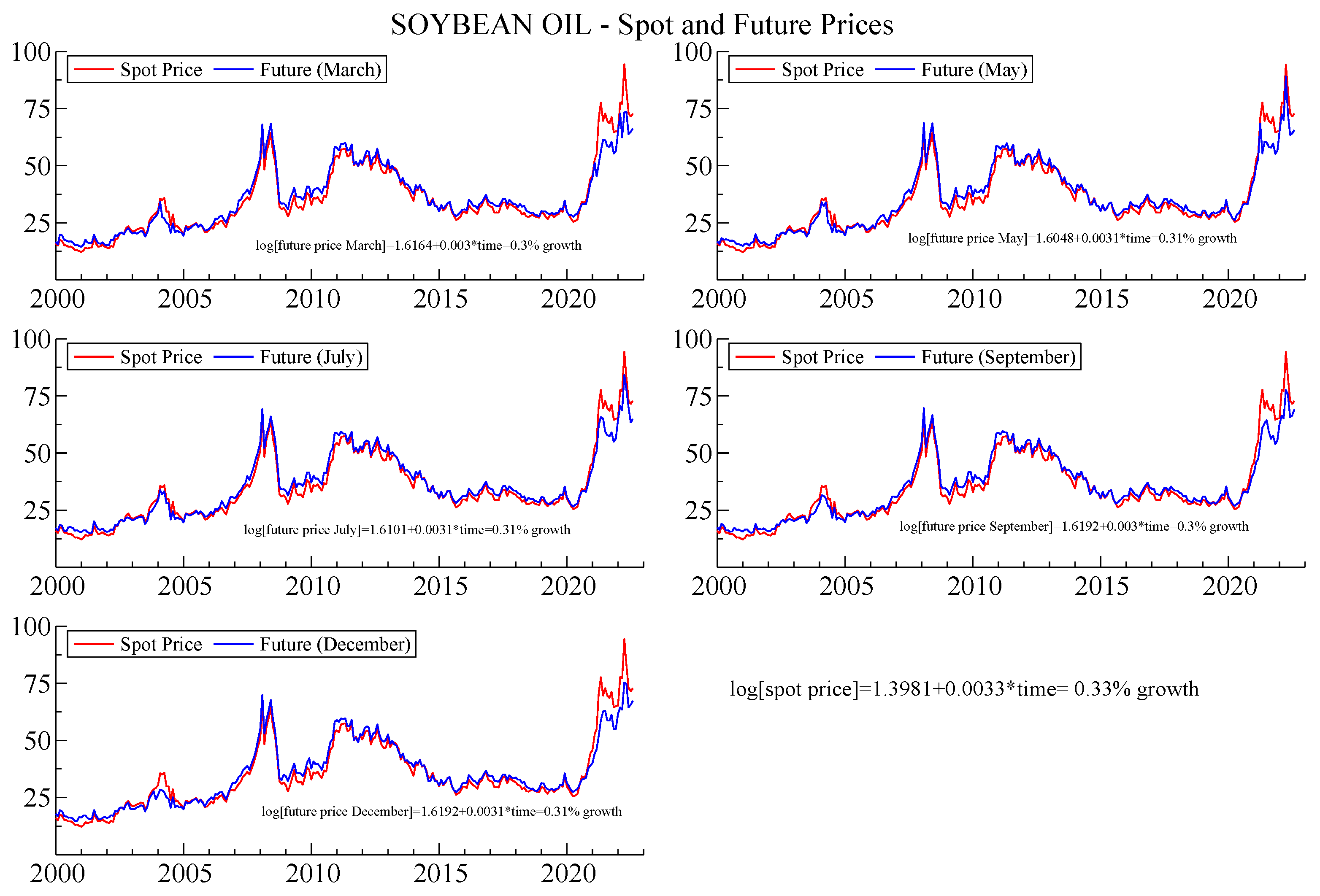 Soybean Oil—Spot and Future Monthly Prices. The figure shows the monthly time series of soybean oil spot prices (red lines) and futures prices (blue lines) across five contract maturities (March, May, July, September, and December), and the estimation of growth equations for each contract to analyze price dynamics. Source: Authors’ elaboration from BarChart database.