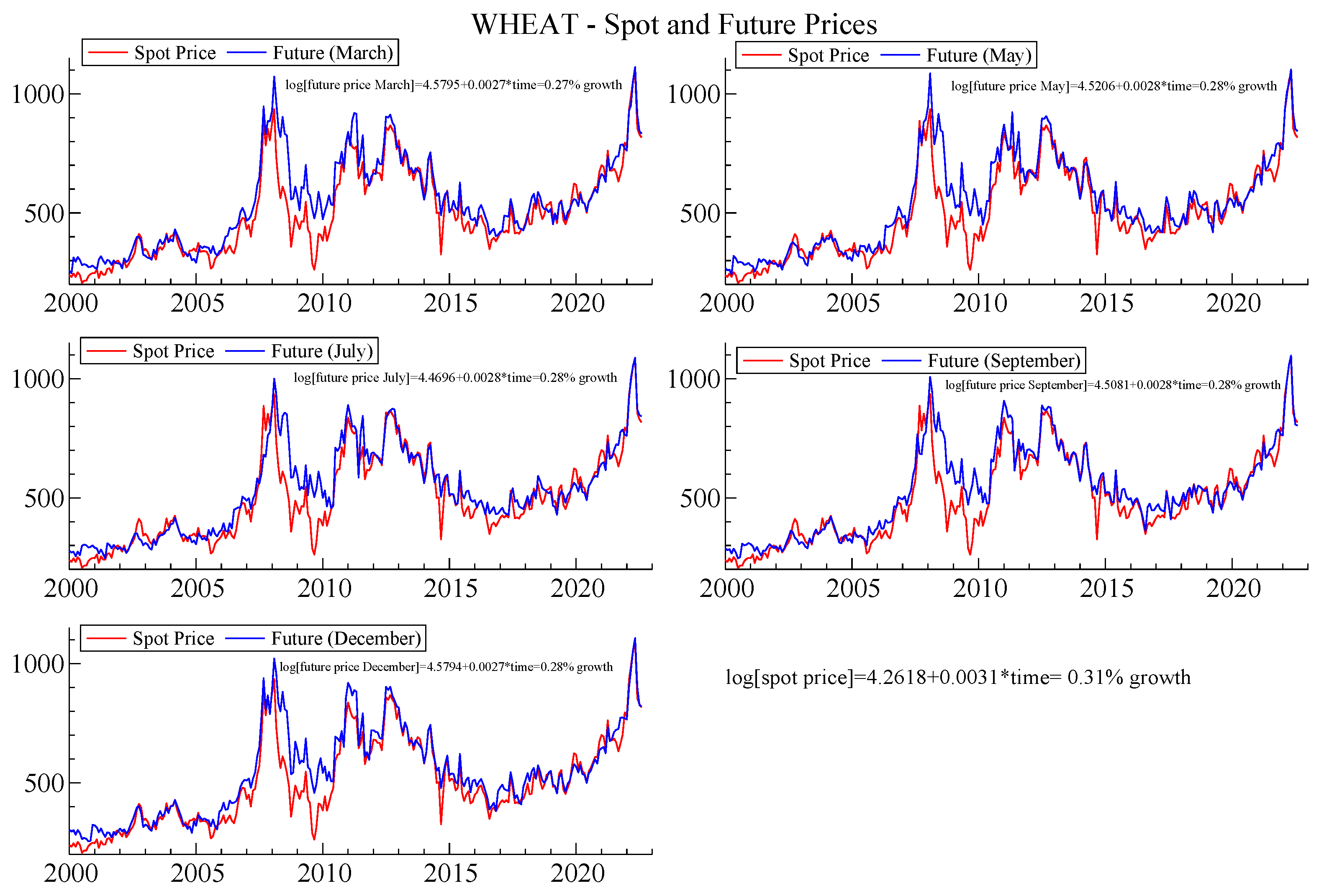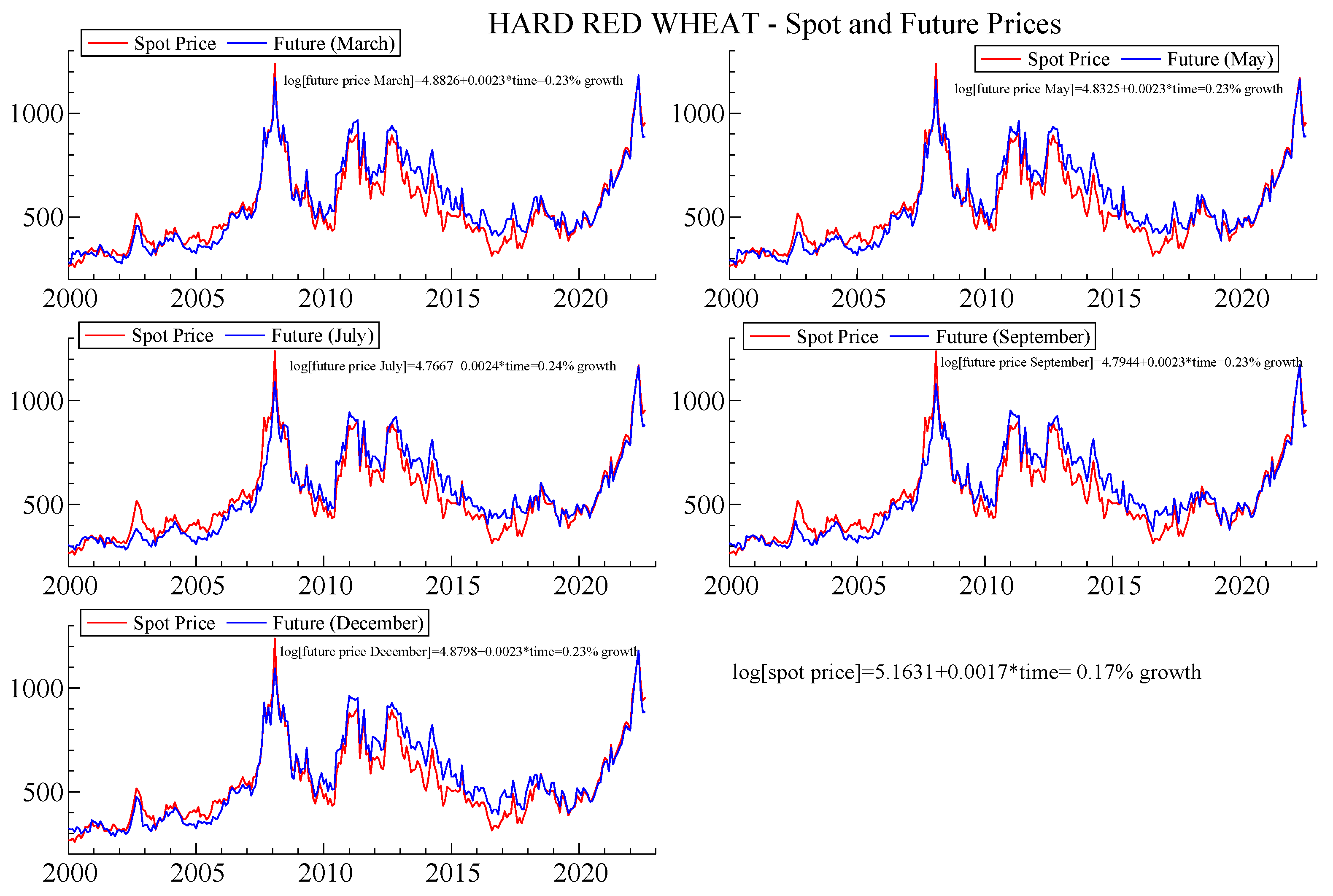 Hard Red Wheat—Spot and Future Monthly Prices. The figure shows the monthly time series of hard red wheat spot prices (red lines) and futures prices (blue lines) across five contract maturities (March, May, July, September, and December), and the estimation of growth equations for each contract to analyze price dynamics. Source: Authors’ elaboration from BarChart database.