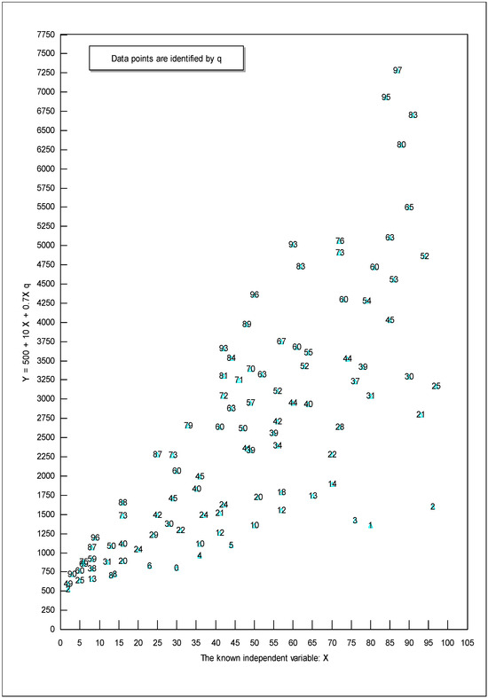 The true value for dY/dX equals 10 + 0.7 q. Since q ranges from 0 to 100, the true slope will range from 10 (when q = 0) to 80 (when q = 100). Thus, q makes an 800 percent difference to the slope. In Figure 1, we identified each point with that observation’s value for q. Notice that the upper edge of the data corresponds to relatively large qs—90, 96, 96, and 97. The lower edge of the data corresponds to relatively small qs—2, 0, 1, and 2. This makes sense since Y increases as q increases for any given X. For example, when X approximately equals 8, reading the values of q from top to bottom of Figure 1 produces 96, 87, 59, 38, and 13. Likewise, when X is approximately 42, the values for q, reading from the top to the bottom, are 93, 81, 72, 60, 21, and 12. Thus, the relative vertical position of each observation is directly related to the values of q. If, instead of adding 0.7 qX in Equation (3), we had subtracted 0.7 qX, the smallest qs would be on the top and the largest qs on the bottom of Figure 1. Either way, the relative vertical position of observations captures the influence of q. In Figure 1, the true value for dY/dX equals 10 + 0.7 q; thus, the slope, dY/dX, will be at its greatest numerical value along the upper edge of the data where q is largest, and the slope will be at its smallest numerical value along the bottom edge of the data where q is smallest.