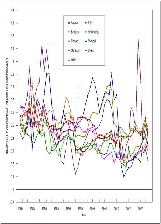 Consider Ireland, which Figure 2 and Figure 3 show had the most unstable d(Gross I)/GDP/d(Gross S)/GDP of all the countries analyzed. Ireland’s β was the most unstable probably because Ireland is a major international financial center with multinational corporations playing an unusually large role in Ireland’s tradeable sector (Lane, 2014), and both traits would facilitate the relatively rapid inflow and outflow of foreign capital. The first β peak for Ireland in Figure 2 occurred in 1979. Ireland’s (Gross I)/GDP rose from 0.285 in 1978 to 0.324 in 1979 before falling to 0.273 in 1980 and staying close to constant at 0.278 in 1981; meanwhile, Ireland’s (Gross Savings)/GDP were 0.182 in 1978, fell to 0.169, then to 0.153, and then to 0.134 in 1979, 1980, and 1981, respectively. Ireland was able to maintain a relatively high (Gross Investment)/GDP ratio during these years of a declining (Gross Savings)/GDP precisely because foreign capital inflows filled the resulting gap. Consequently, Ireland’s estimated β for the gross analysis rose from 0.840 in 1978 to 1.138 in 1979, fell to 0.922 in 1980, and rose again to 1.090 in 1981.