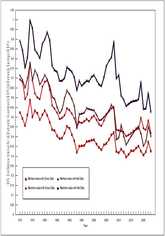 Figure 6 shows 95% confidence intervals for each year of the data for the RTPLS estimations when both gross and net data are used. When calculating confidence intervals for a particular observation, we used Equation (11) with that observation’s RTPLS estimate and the RTPLS estimates for the four observations preceding it for that country. For Figure 6, we used Equation (11) and all the RTPLS estimates for all the countries each year. Figure 6 clearly shows that d(Gross I)/GDP/d(Gross S)/GDP and d(Net I)/GDP/d(Net S)/GDP are falling over time. Furthermore, this fall is statistically significant as shown by these confidence intervals not overlapping in all years. These results suggests that the global glut of savings has worsened over time—when all 22 countries in the data set are considered, the amount of production-expanding investment as a percent of GDP is falling relative to the amount of savings as a percent of GDP.