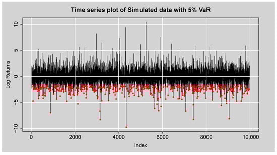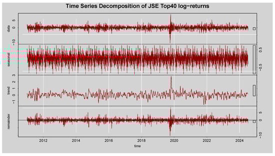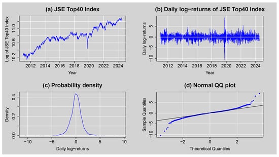 The study is going to use daily closing prices of the JSE Top40 Index for a specific time period from 31 January 2011 to 25 February 2025, totalling 3515 trading days. The data, which are freely available, can be accessed at https://za.investing.com/indices/ftse-jse-top-40-historical-data (accessed on 25 April 2025). The data are collected over a five-day trading week. To enhance the robustness and comparative strength of the analysis, an extended dataset covering the period from 3 January 2011 to 27 October 2025, totalling 3704 trading days, was also used for comparison. The JSE Top 40 Index data were compared with the MOEX Russian Index over the same period. The daily MOEX Russian Index data were obtained from the Investing.com database, accessible at https://in.investing.com/indices/mcx-historical-data (accessed on 4 November 2025). Both datasets consist of daily observations and are used to provide broader market coverage and assess the robustness of the proposed method under different market conditions. For forecast evaluation, the in-sample (estimation) period covers 31 January 2011 to 29 February 2024, while the out-of-sample (forecast) period spans 1 March 2024 to 25 February 2025. The rolling window forecasting procedure and 1-day-ahead forecast methodology are described in detail in Section 3.2.3.
