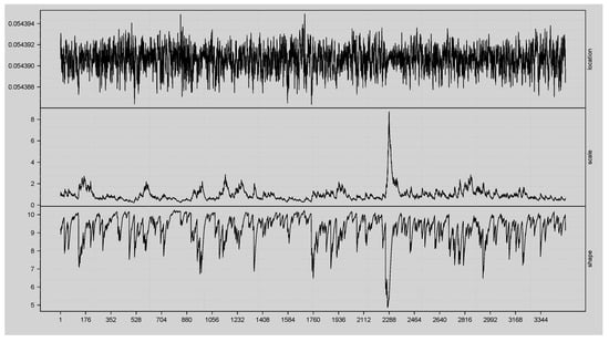 Here, represents a matrix function. Since the updating mechanism in Equation (3) depends on the scaled score vector in Equation (4), we define Equations (2)–(5) as the foundation of the GAS model with orders p and q. For simplicity, we refer to this model as GAS. The use of the score to update is straightforward. The steepest climb route improves the model’s local fit in terms of likelihood or density at time t, based on the current position of parameter . This indicates the obvious direction for updating the parameter. The score is based on the whole density, not just the first- or second-order moments of the observations . The GAS framework stands out among observation-driven techniques in the literature. The GAS model uses the whole density structure to transform data and update time-varying parameters . The GAS model’s scaling matrix provides flexibility in how the score is updated for . Changing the scaling matrix yields a unique GAS model. Each of these models has unique statistical and empirical aspects that need to be examined separately. Scaling based on score variance is a common approach in several scenarios. For instance, we can provide the scaling matrix as