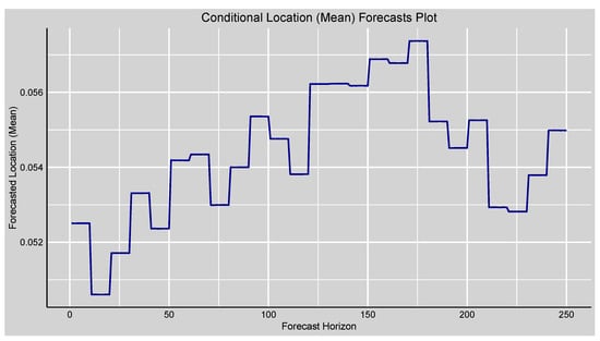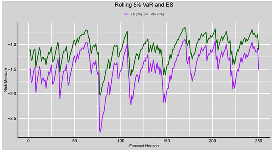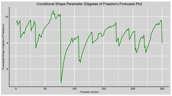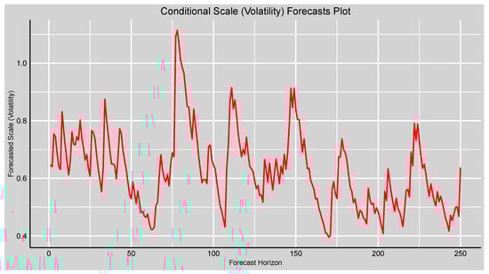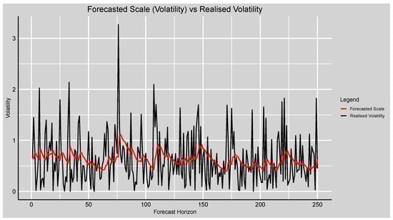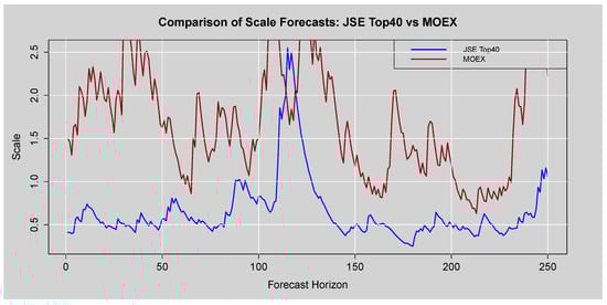 The scale forecasts given in Table 26 represent future volatility. Across all forecast horizons (), the scale forecast for the MOEX is consistently and substantially higher than for the JSE Top40, often by a factor of 3 or 4. This confirms the model’s conclusion that the future volatility environment for the MOEX is predicted to remain significantly more turbulent than for the JSE. A plot of the scale forecasts is given in Figure 23.