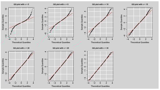 To assess the performance of models, we use evaluation metrics such as Akaike information criterion (), and Bayesian information criterion. The R software package is used to compute the value of , and . The formulas for and are given by the following Equation (13):