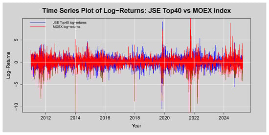 Time series plot of log-returns of the JSE Top40 and MOEX indices.