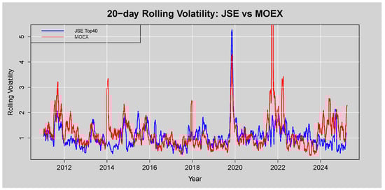 The 20-day volatility of the MOEX consistently runs above that of the JSE Top40, as shown in Figure 22, with pronounced peaks during periods of crisis that far exceed any volatility spikes seen in the South African market.