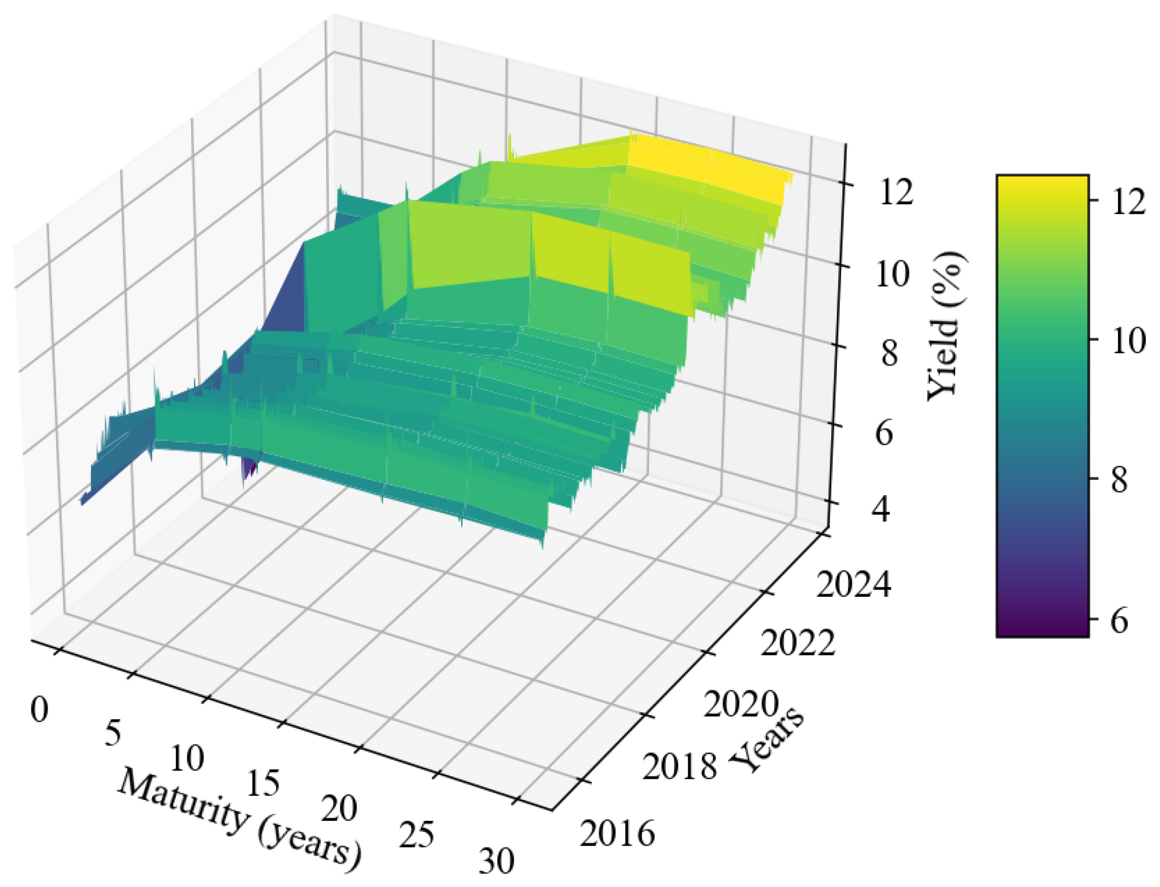 Figure 1 presents both the cross-section and time series of yields. It demonstrates a clear upward trend in yield levels from 2015 to 2024. In the earlier years (2015–2016), yields were comparatively low, averaging around 8%, but began rising steadily, reaching a local peak around 2020. By 2024, yields remain elevated compared to the beginning of the period, suggesting a steep rate increase.