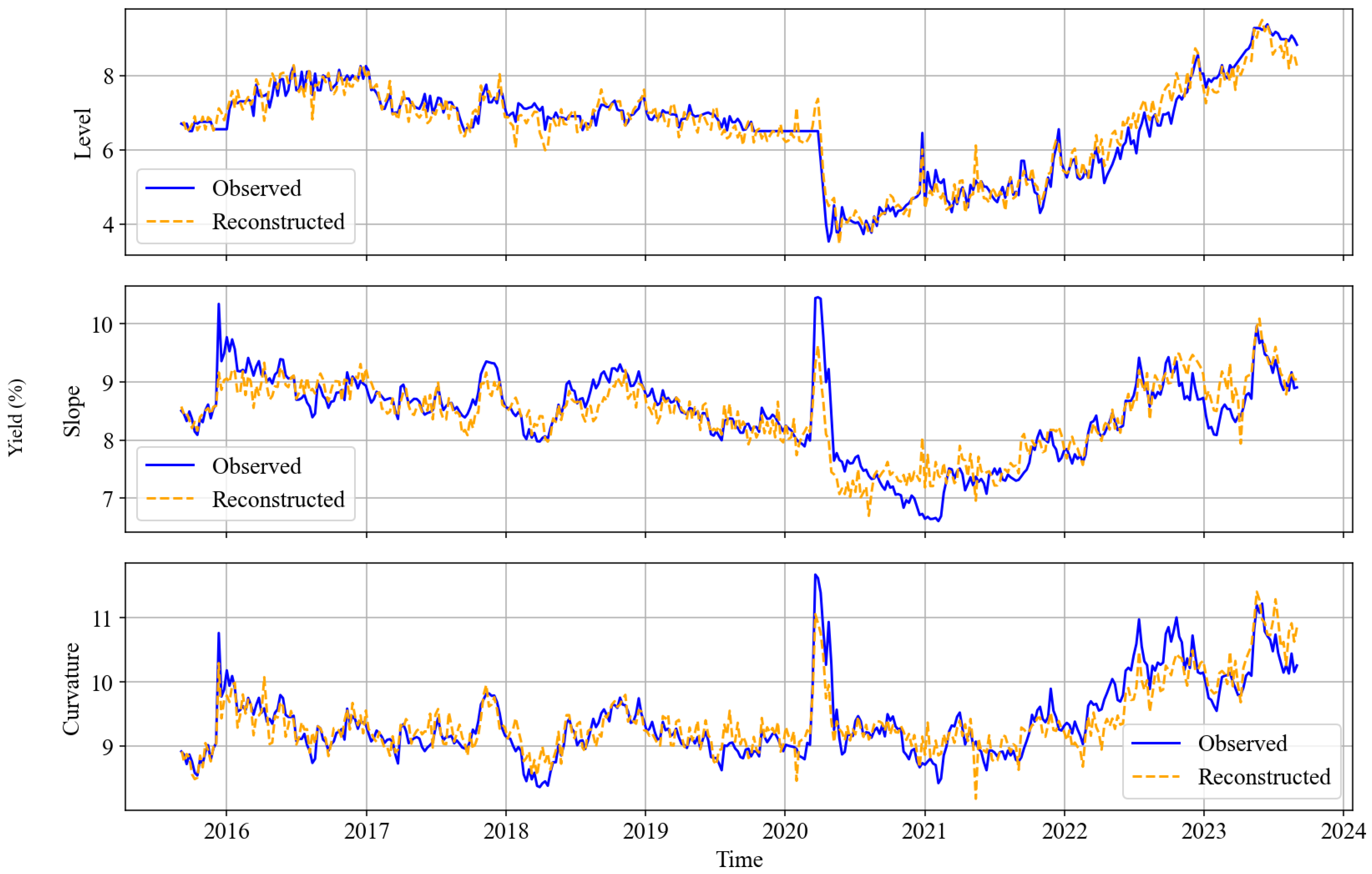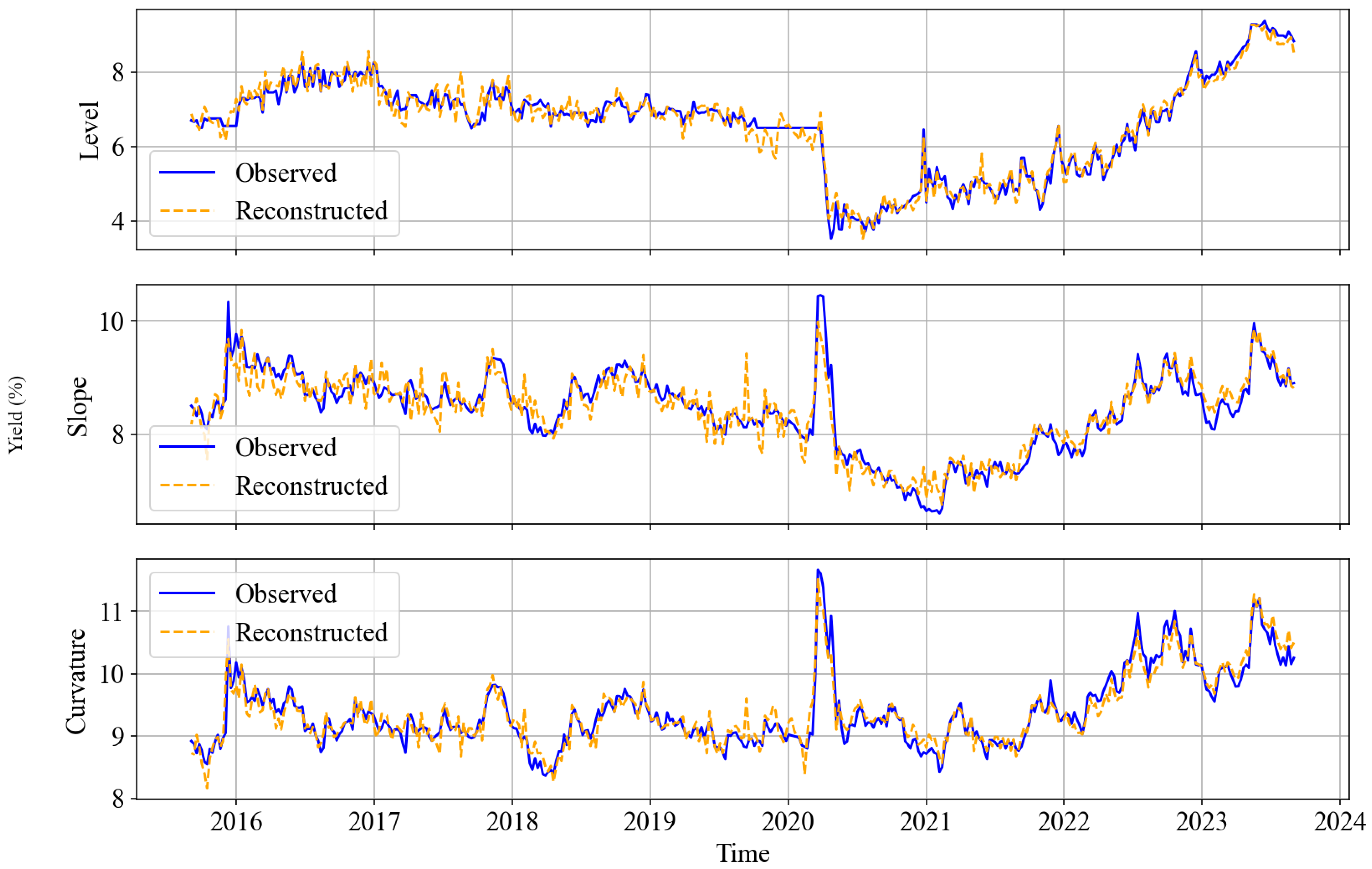 represent the level, slope, and curvature factors of the yield curve, respectively. These three latent components capture the dominant cross-sectional movements in yields across maturities and provide an economically interpretable representation of the term structure dynamics.