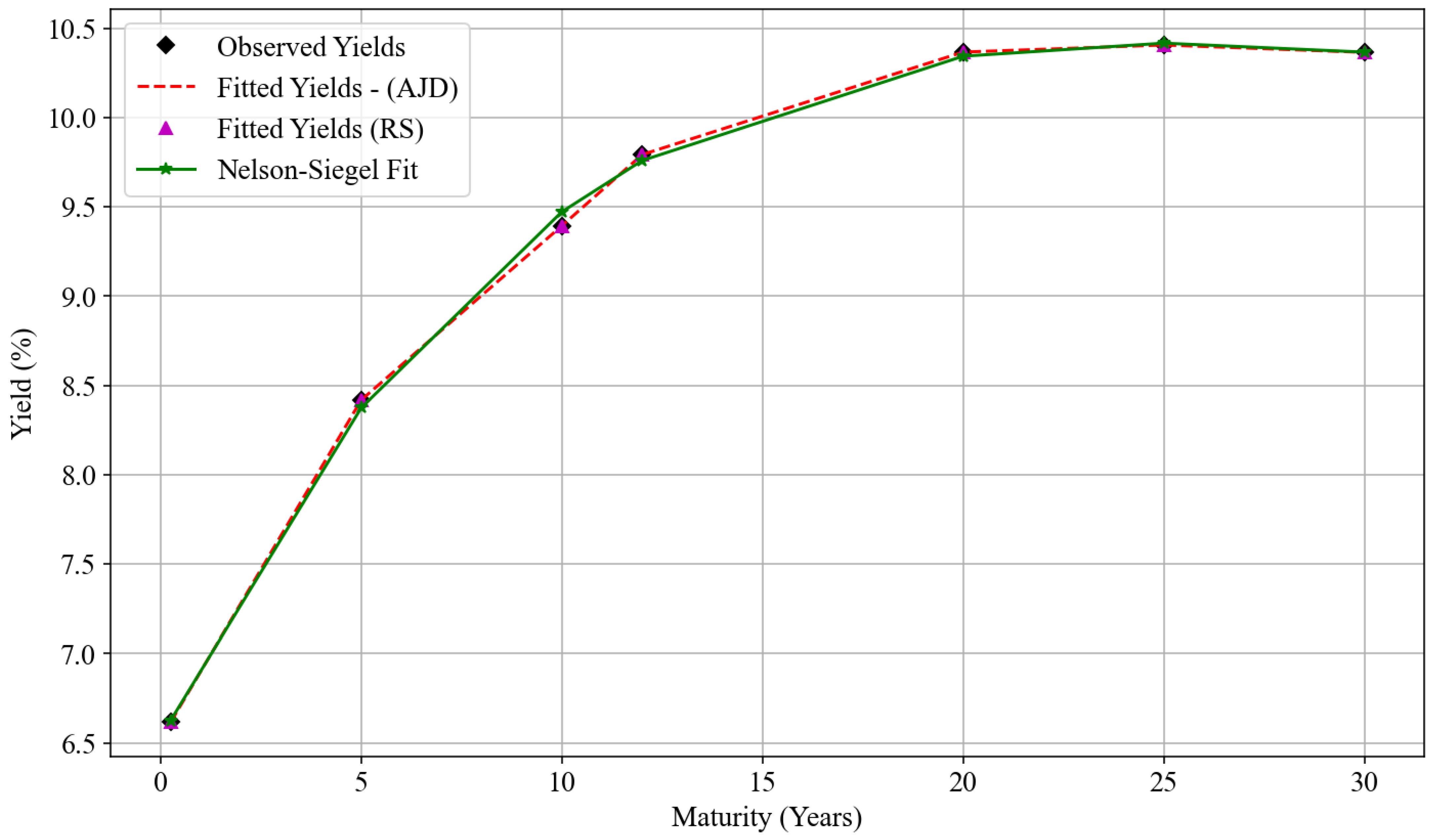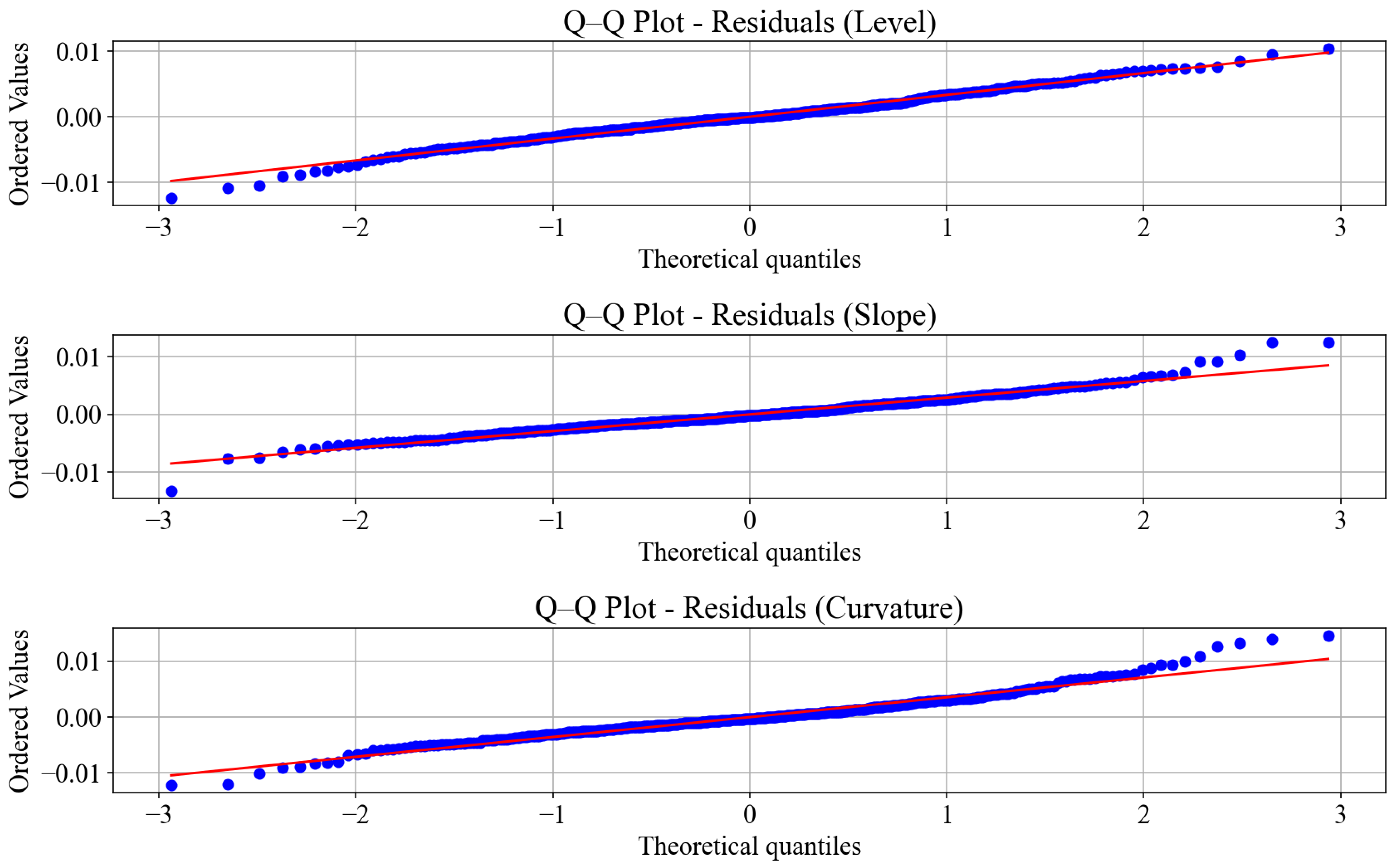 Our key contributions are threefold. First, we formally demonstrate that the regular affine process specification naturally extends RS-AJD models. Second, we employ the UKF for efficient state estimation and model calibration, which enables accurate yield curve fitting in the presence of latent factors and nonlinearities. Third, empirical results show that the fitted models produce residuals that closely approximate Gaussian white noise, as confirmed through residual diagnostics and Q-Q plots—indicating improved model specification and robustness in capturing interest rate dynamics. Unlike the three-factor yield curve model based on the Diebold-Li extension of Nelson–Siegel as recently applied by