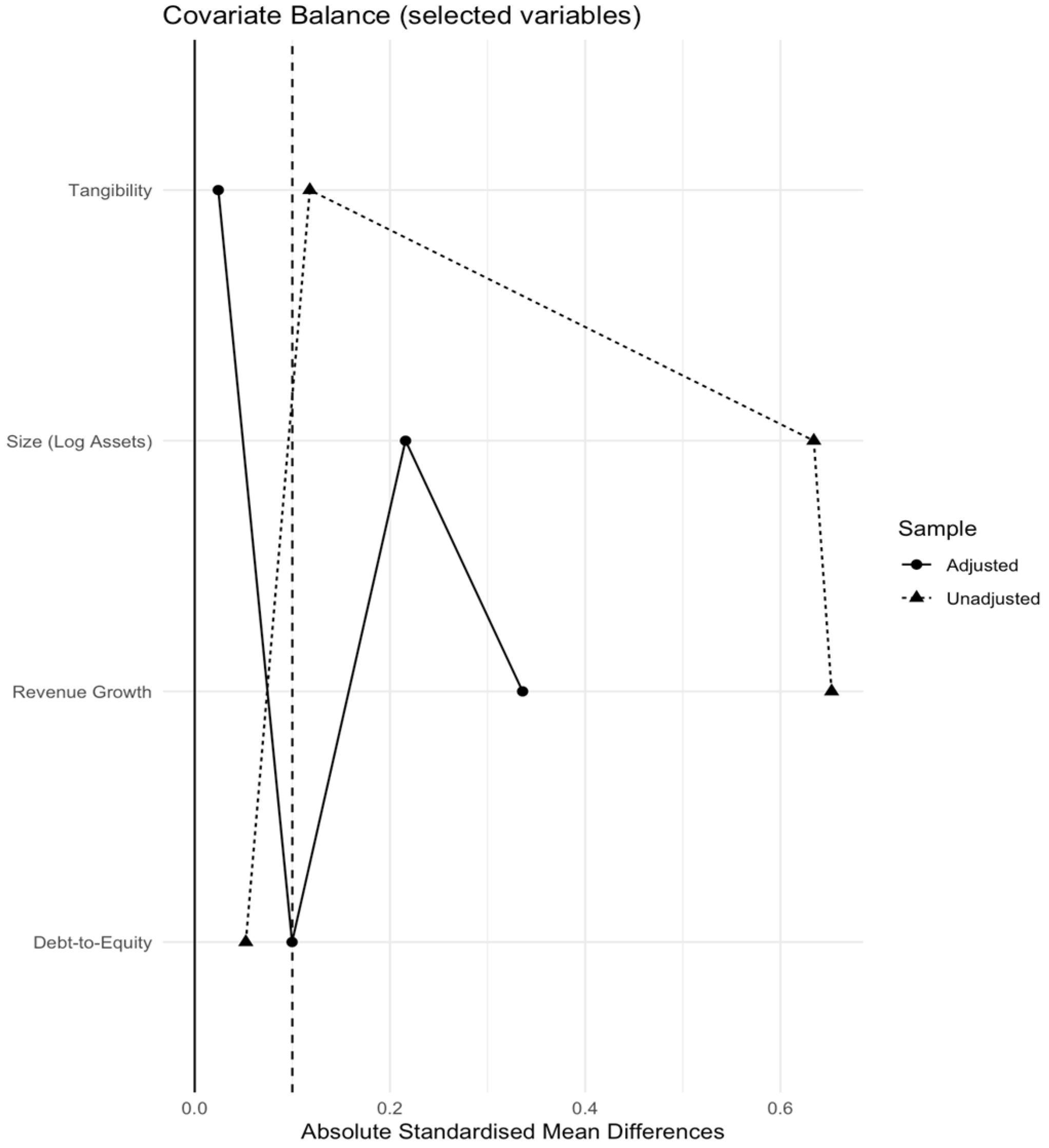 In this framework, overall ATT represents the average effect of ESG100 inclusion across all post-treatment periods for the treated firms relative to their matched controls. It summarises the average post-treatment effect without differentiating across specific years. Event-time coefficients (k = −3 to +3) measure the treatment effect at different relative time points around ESG100 inclusion, where k = 0 denotes the year of first inclusion, negative values (k = −1, −2, −3) capture pre-treatment years, and positive values (k = 1, 2, 3) capture post-treatment years. By construction, k = −1 serves as the reference period, hence no coefficient is estimated for that year. Statistical significance of these coefficients indicates whether ESG100 inclusion led to performance changes at specific points in time, while pre-treatment coefficients (k < 0) allow for testing of parallel trends.