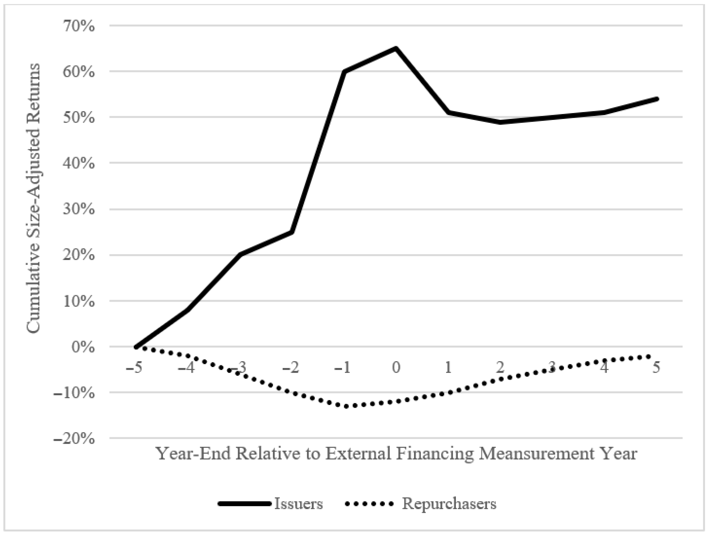 Figure 1 plots the cumulative size-adjusted stock returns for firms in the extreme external financing deciles (issuers versus repurchasers) over an eleven-year window centered on the measurement year (year 0). The figure shows a generally symmetric pattern around the financing year. Firms classified as issuers experience a pronounced run-up in cumulative returns before year 0, peaking at roughly 65%, while repurchasers show a gradual decline to about −15% over the same period. After the financing year, issuer returns flatten and partially reverse, whereas repurchaser returns recover steadily.