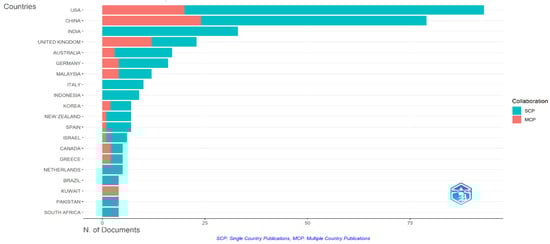Figure 3 illustrates the global distribution of research output, distinguishing between Single Country Publications (SCP) and Multiple Country Publications (MCP) on the studied topic. The United States leads with the highest output, driven largely by SCPs, reflecting its robust datasets, financial markets, and institutional support. China follows, also dominated by SCPs, signalling growing domestic research capacity. India ranks third but stands out for its high SCP share, reflecting reliance on international collaboration and global expertise. Other notable contributors include the UK, Australia, Germany, and Malaysia, with European countries generally showing a more balanced SCP–MCP mix. Emerging players such as Indonesia, Korea, and Spain contribute modestly, while countries like Kuwait, Pakistan, and South Africa remain nascent in this domain.