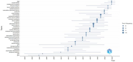 Figure 5 tracks the chronological development of research themes. Each bubble represents the central tendency of the publication year for a given term. Specifically, we compute the average publication year across all articles in which the term appears and use this value for the horizontal position of the bubble. The size of the bubble is proportional to the total frequency of the term in the corpus, so larger bubbles indicate terms that appear more often. The horizontal line associated with each term spans from the first year in which the term occurs in our dataset to the last year in which it appears and therefore summarises the active period of that research theme. In the early phase (2000–2010), studies were rooted in classical finance, focusing on dividend policy, signalling, and information asymmetry. Between 2010 and 2015, attention shifted toward market efficiency and corporate event reactions. From 2015 to 2020, the literature expanded into behavioural finance, with investor sentiment, event studies, and textual analysis gaining prominence. Most recently (2020–2025), focus has turned to ESG, COVID-19, institutional investors, and abnormal returns, reflecting global shocks and sustainability imperatives. Overall, the progression highlights a shift from traditional finance to interdisciplinary approaches that integrate behavioural insights, machine learning, and ESG concerns.