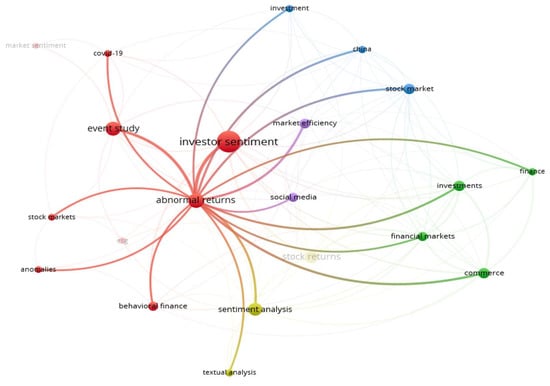 As shown in Figure 6, the keyword co-occurrence analysis provides valuable insights into the thematic structure of the existing literature on the relationship between ESG factors and abnormal returns, particularly considering the roles of investor sentiment. The terms abnormal returns and investor sentiment emerge as the most central and strongly interconnected nodes. This highlights the dominant role that investor sentiment plays in explaining deviations from expected returns, reinforcing its relevance in both traditional and emerging asset pricing models.