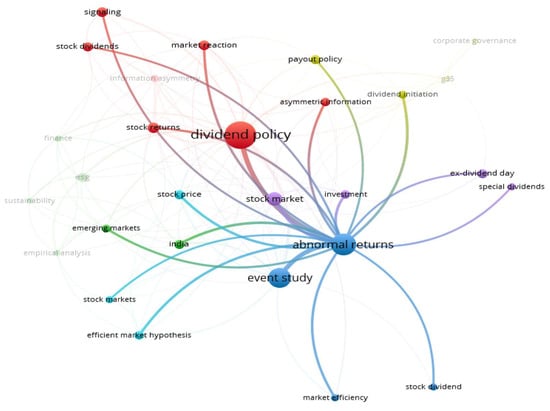 Interestingly, the appearance of ESG and sustainability in the green cluster indicates a nascent intersection between sustainable finance and dividend policy. However, the weak linkage between these terms and the core concepts (dividend policy, abnormal returns) suggests that the mediating or moderating effects of dividend policy in ESG performance-related market reactions remain underdeveloped in the current literature. This confirms the gap identified in the previous map and reinforces the need for integrated research exploring how ESG strategies affect dividend signalling and the resulting abnormal returns.