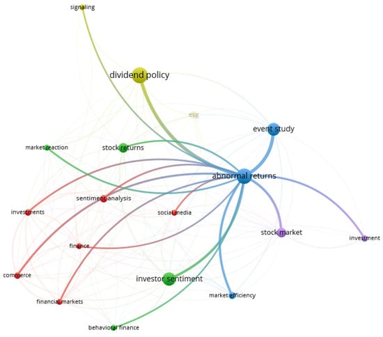 The blue and purple clusters consolidate keywords related to methodological approaches, including event study, stock market, market efficiency, and investment. These terms highlight the empirical rigour commonly applied in studies of abnormal returns, particularly when analysing market responses to earnings announcements, dividend declarations, or sentiment shocks. The continued reliance on event study methodology reinforces its utility in quantifying short-term return deviations attributable to specific information events.