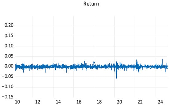 To address the issue of non-stationarity in the price data, the first difference in the price series (returns) is calculated. Figure 2 displays the behaviour of the BAX returns over the examined period. The figure reveals that the return series is stationary. Similarly, the results of the ADF test on the BAX returns, displayed in Table 2, confirm the outcomes obtained from graphing the series. The T-statistics of the return series (−29.97) is much higher than the critical T values (−3.4327) at the 1% level of significance. This indicates that the null hypothesis of non-stationarity is rejected at the 1% level of significance or better. The results of the PP test and KPSS test strongly support the conclusion drawn from the ADF test, confirming the stationarity of the return series.
