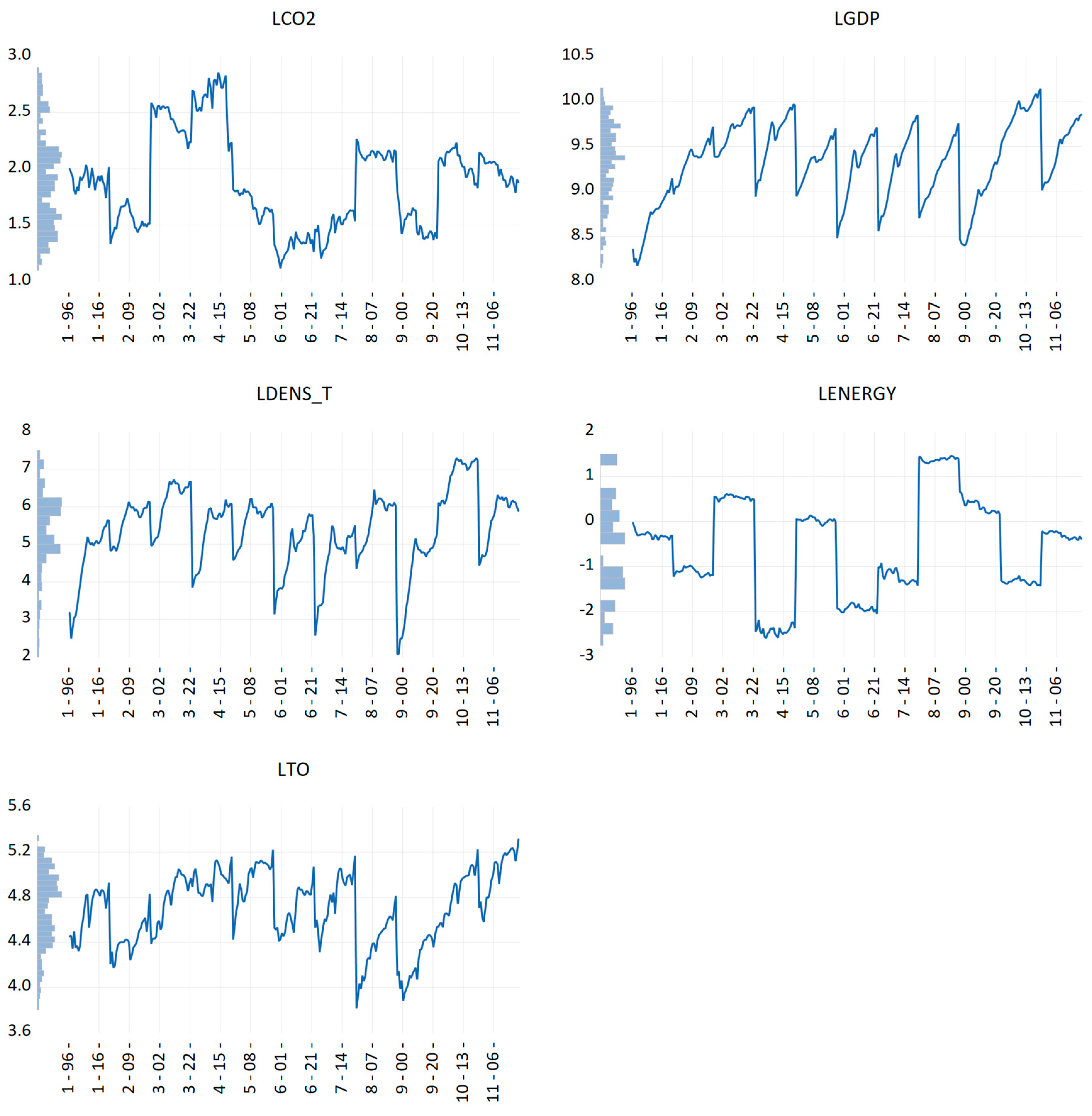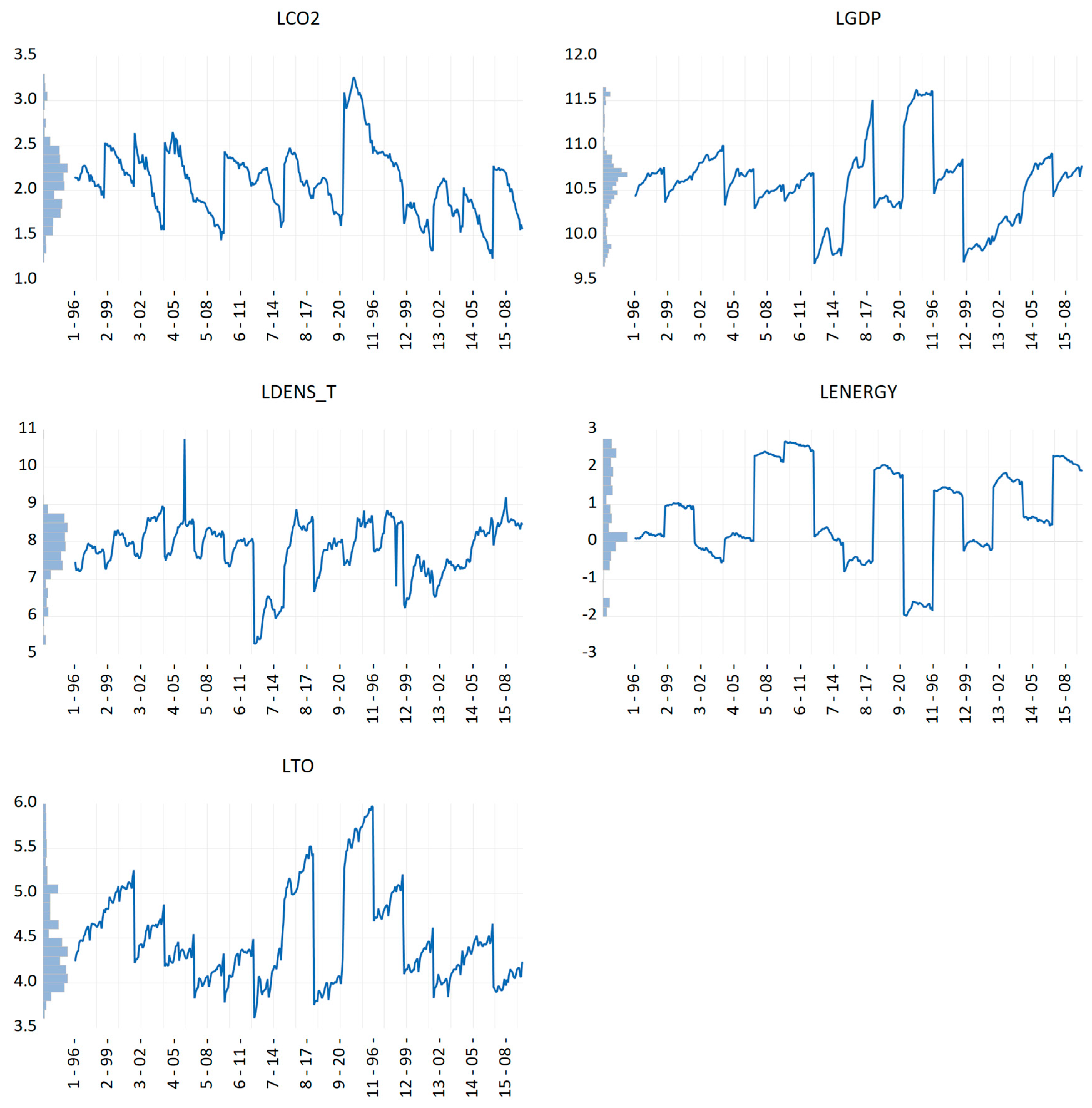 Appendix A, the time-series dynamics of each variable are displayed for each cross-sectional unit, with the corresponding histogram shown on the vertical axis. We test for potential multicollinearity to assess whether the explanatory variables in the models are independent. They indicate that the tolerance values are well above the benchmark value of 0.2, and the VIF (Variance Inflation Factor) values are below 5, suggesting the absence of multicollinearity among the regressors. This implies that the selected factors can be considered valid explanatory variables for the dependent variables
